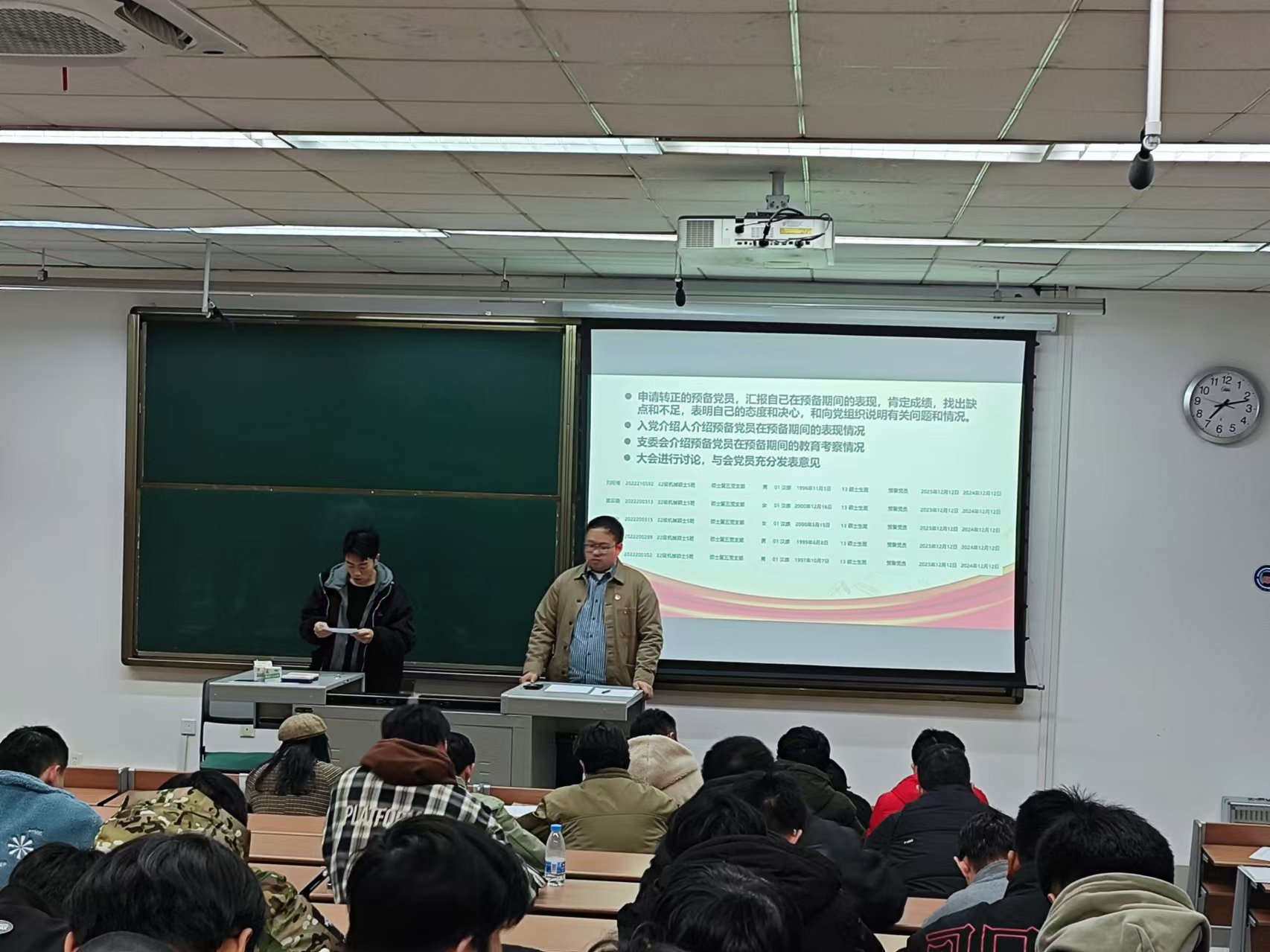 会议第一项议程是预备党员转正,本次会议讨论关于刘翔博、粟军霞、章澜夕、胡豪、严腾飞5位同志是否能按期转为中共正式党员。党支部书记殷应琦同志对议程相关要求进行讲述,要求申请转正的预备党员,汇报自己在预备期间的表现,肯定成绩,找出缺点和不足,表明自己的态度和决心,和向党组织说明有关问题和情况。入党介绍人介绍预备党员在预备期间的表现情况。支委会介绍预备党员在预备期间的教育考察情况。大会进行讨论,与会党员充分发表意见。最后正式党员对五位预备党员能否转正进行无记名投票表决。