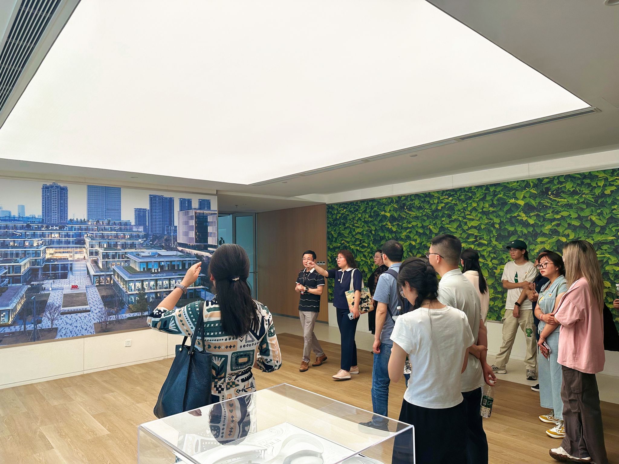 作为中国西部首个“近零碳建筑”,中建滨湖设计总部坐拥兴隆湖生态景观,其设计巧妙融合地域气候特征,采用双首层布局、层层退台形式呼应兴隆湖原始地形,构建出与自然共生的办公空间。在中建西南院双碳工程技术研究中心总工程师钟辉智的全程导学下,师生们首先参观了企业展示大厅,通过详实的项目模型、多媒体展示,系统学习了绿色建筑从概念设计到具体实施的全过程,深入理解了其作为公园城市示范区核心载体的技术内涵及建筑全生命周期的减碳逻辑。