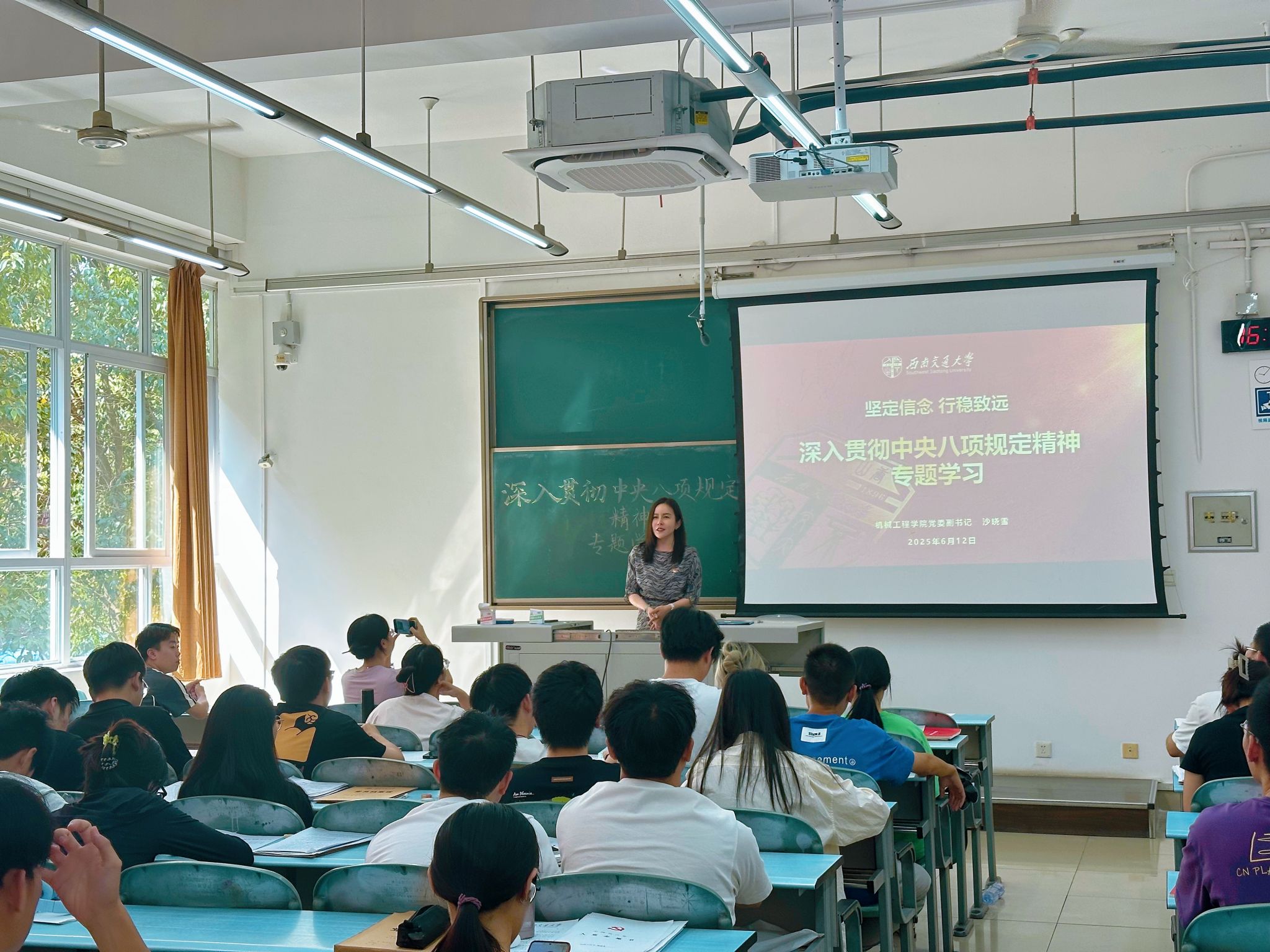学院党委副书记沙晓雪以 “坚定信念,行稳致远——深入贯彻中央八项规定精神”为题,为支部党员讲授专题党课。她从历史纵深与现实需求出发,系统阐释了中央八项规定的出台背景与核心要义,强调其作为 “长期有效的铁规矩、硬杠杠” 的政治意义。同时结合中央八项规定从制定到实施的重要时间节点,解读了中央八项规定和中央八项规定精神的区别。
