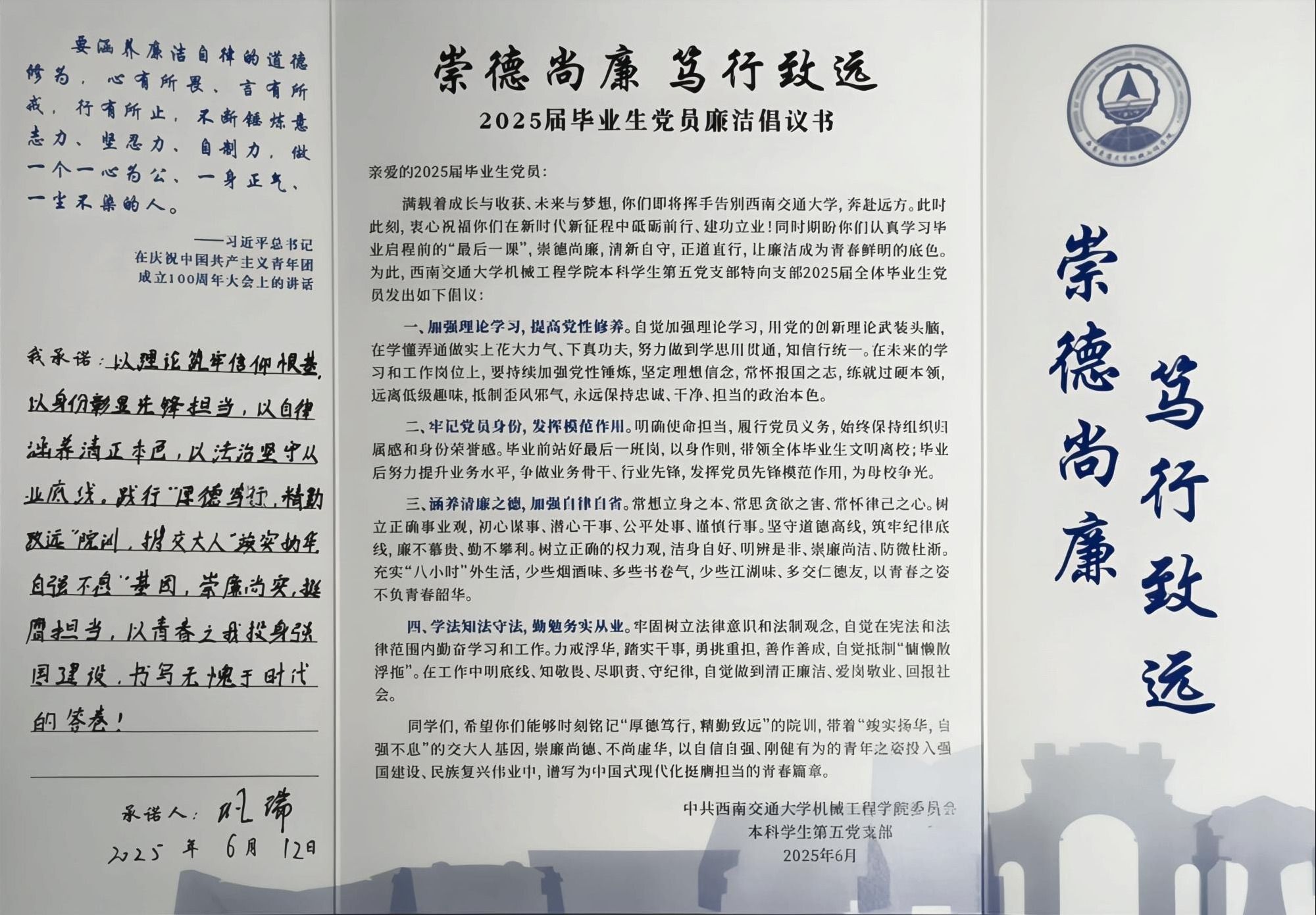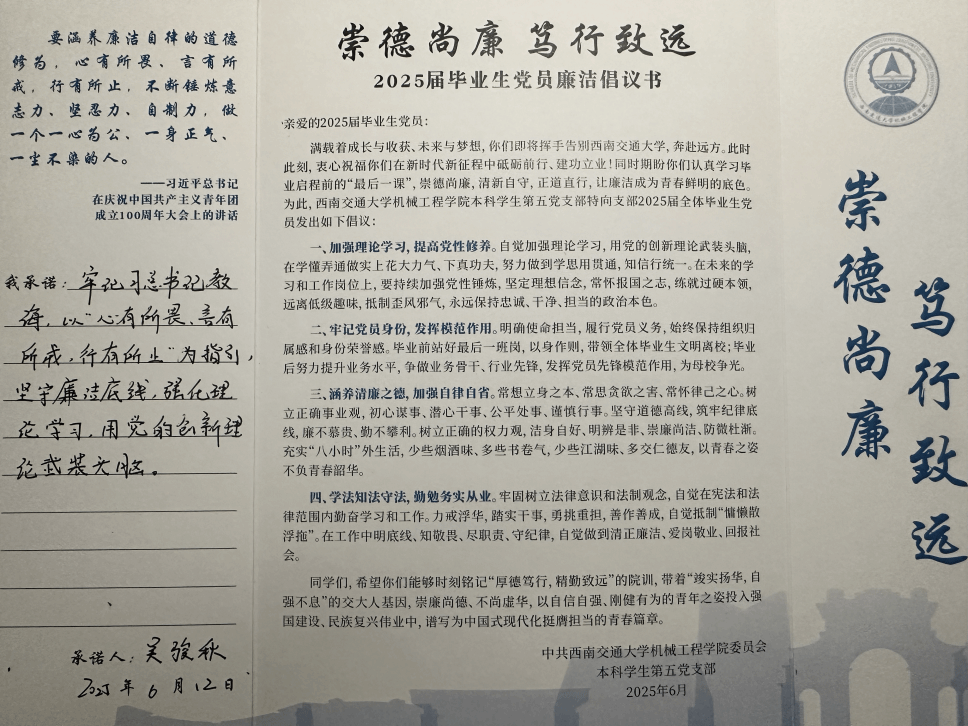 最后,在庄严的氛围中,全体毕业生党员签署《廉洁承诺书》。一笔一划间,许下的是 “知敬畏、存戒惧、守底线” 的青春誓言,更是 “把廉洁作为青春鲜明底色” 的郑重承诺。