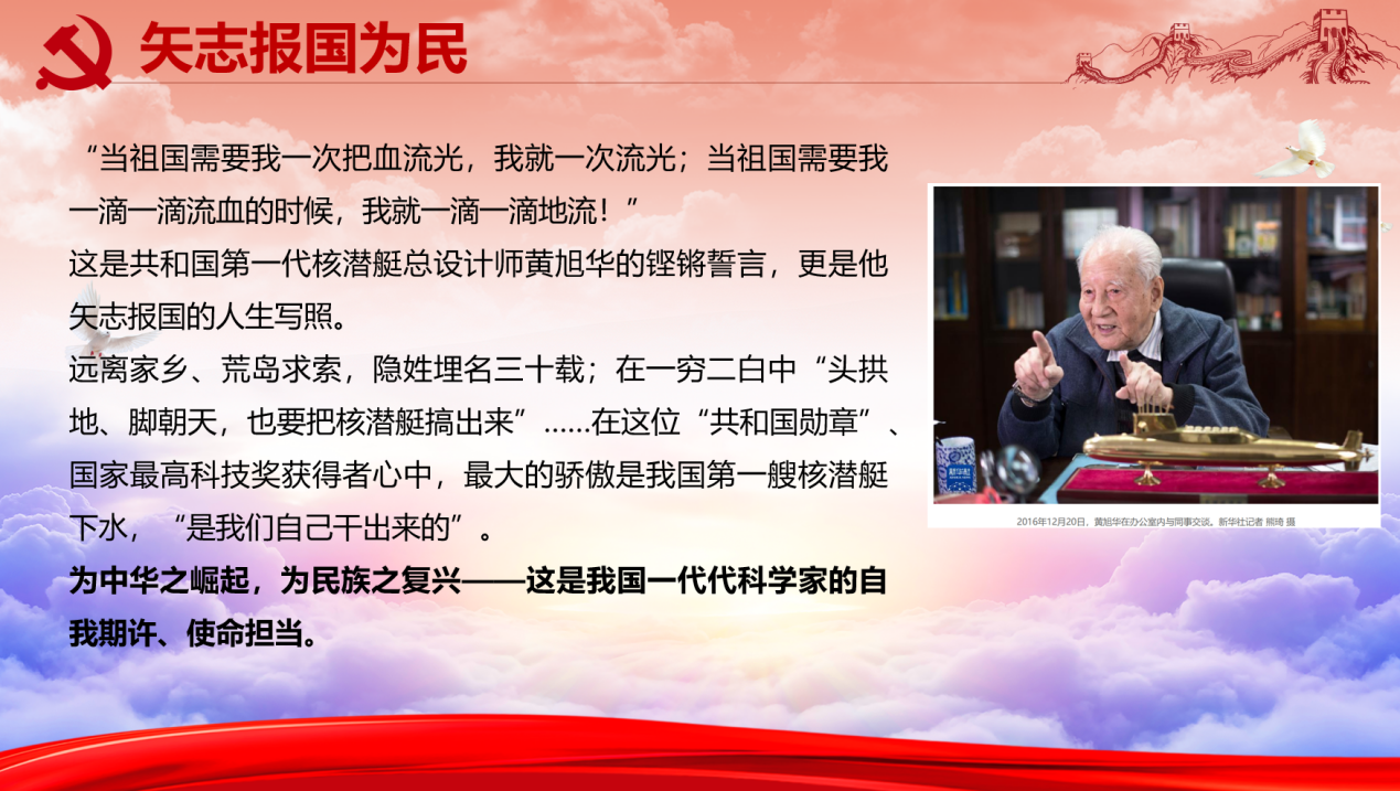 黄旭华,共和国第一代核潜艇总设计师,远离家乡、荒岛求索,隐姓埋名三十载,在一穷二白中 “头拱地、脚朝天,也要把核潜艇搞出来”,他用一生诠释了矢志报国的誓言,最大的骄傲是我国第一艘核潜艇下水,“是我们自己干出来的”。