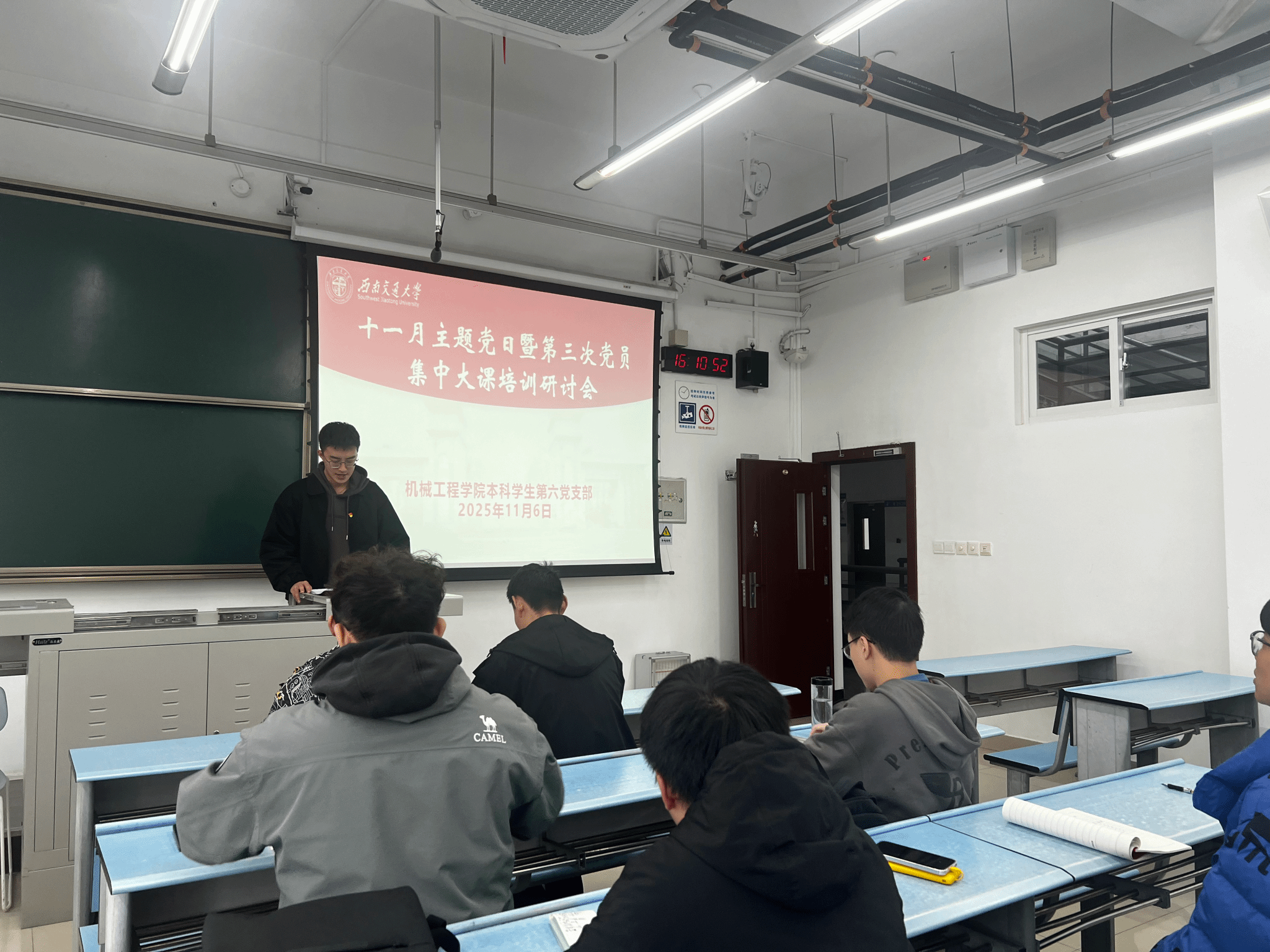 2025年11月06日星期四,本科学生第六党支部在犀浦校区2号教学楼X2423深入学习贯彻习近平总书记关于教育的重要论述,以教育强国支撑引领中国式现代化,学习贯彻党的二十届四中全会精神,结合党员思想实际和学习工作实际开展交流研讨。会议由于浩然同志主持。