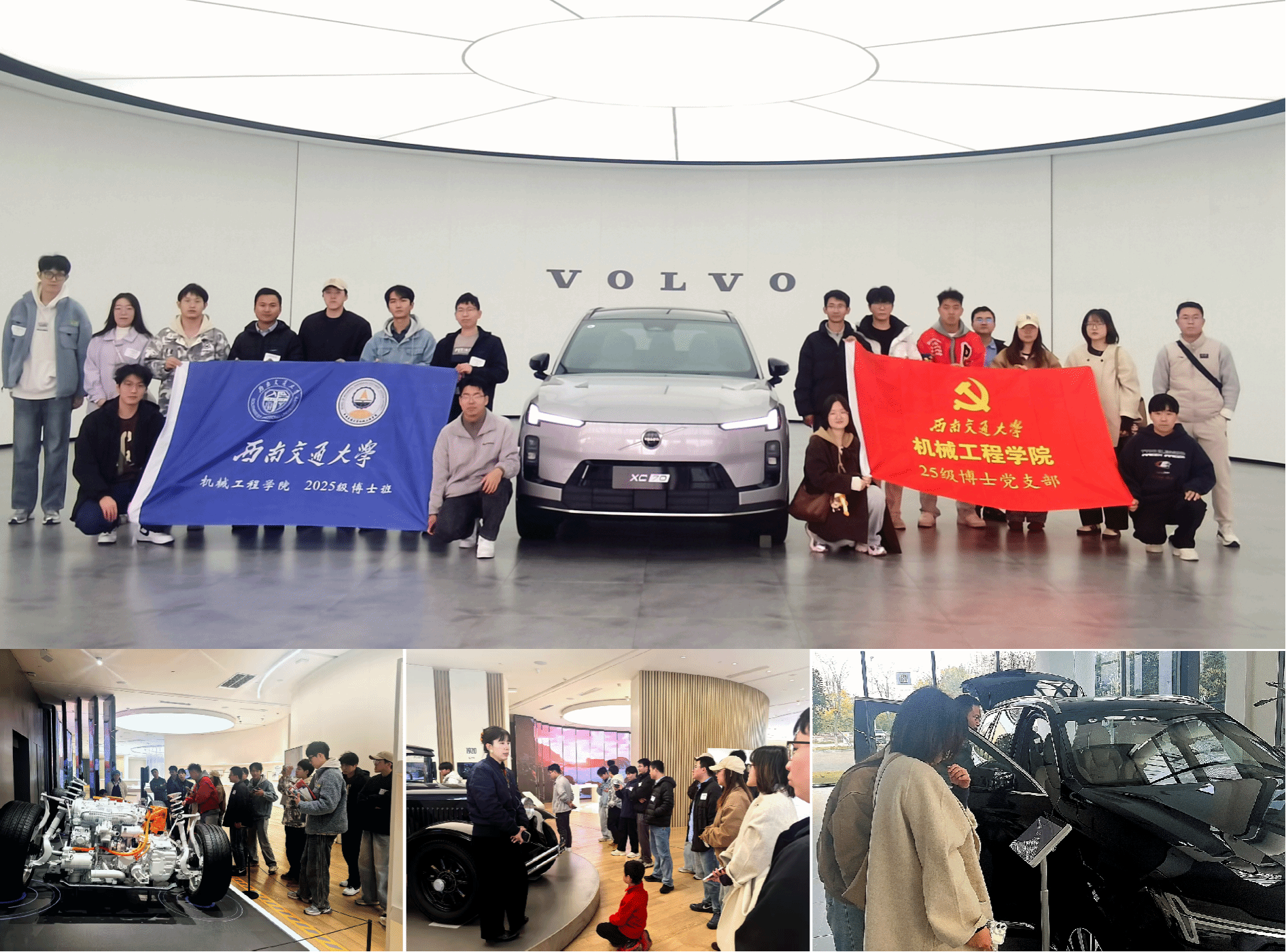 第一期【实景研学:走进沃尔沃工厂】支部于11月7日组织成员赴沃尔沃汽车集团成都制造基地开展实地研学,全体党员在公司内合影留念,展现出积极向上、团结奋进的精神风貌。随后,在技术人员的引导下,大家依次深入冲压、焊接、总装等核心生产车间,近距离观摩了高度自动化、数字化的汽车制造全流程。重点参观了机器人精准焊接、柔性生产线调度、质量实时监测等智能制造场景。通过此次沉浸式学习,党员同志们对高端装备制造的系统集成、工业互联网的应用实践以及可持续发展理念在产业中的落地有了更深刻的认识,进一步增强了将学术研究面向国家战略和产业需求的使命感。