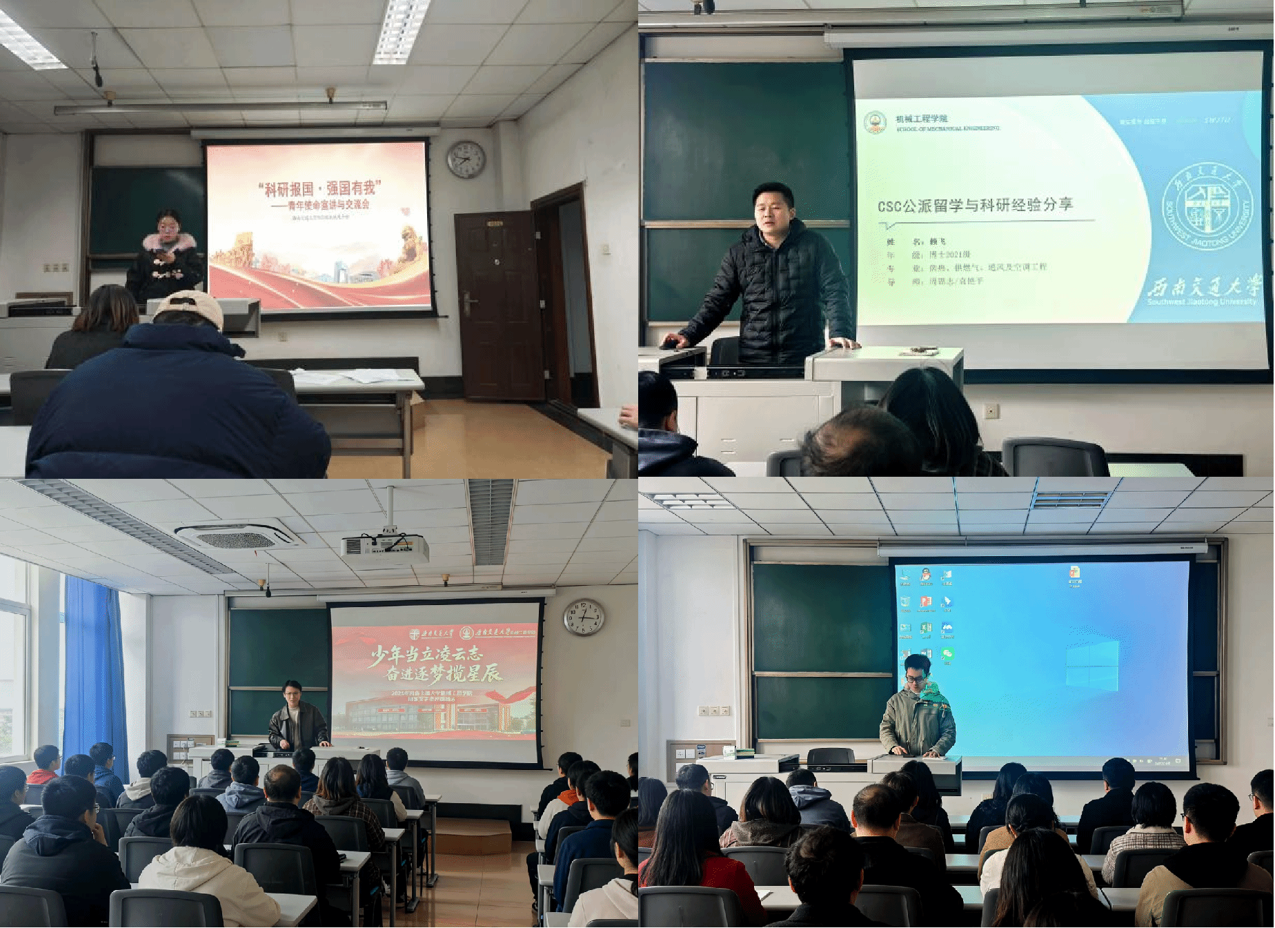 第二期【优秀学子对话沙龙】 11月28日,支部在九里校区举办“科研报国·强国有我”专题沙龙,特邀三位在学术科研、国际交流、就业发展等方面表现突出的博士嘉宾进行分享。供热、供燃气、通风及空调工程专业赖飞博士结合其海外联合培养经历,系统介绍了国际高水平科研合作与论文发表策略;摩擦学研究所车辆工程专业国家奖学金获得者罗易飞博士从课题切入、实验设计到成果凝练,分享了扎实的科研方法论与时间管理经验;机械制造及其自动化专业国家奖学金获得者刘名远博士则围绕博士生职业规划、产学研结合路径以及心态调适等方面展开交流。在互动环节,支部成员积极提问,嘉宾耐心解答,现场气氛热烈。本次活动为低年级博士生提供了宝贵的学术导航与精神激励,增强了大家的科研信心与发展方向感。