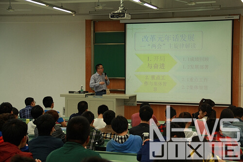 2014年4月21日晚19:30,pp电子官方网站入党积极分子党课培训暨团校培训活动在4359教室开展,组织者有幸请到政治学院的严冰教授为大家带来“改革元年话发展——两会主旋律解读”主题讲座,为同学们解读两会中的改革问题。