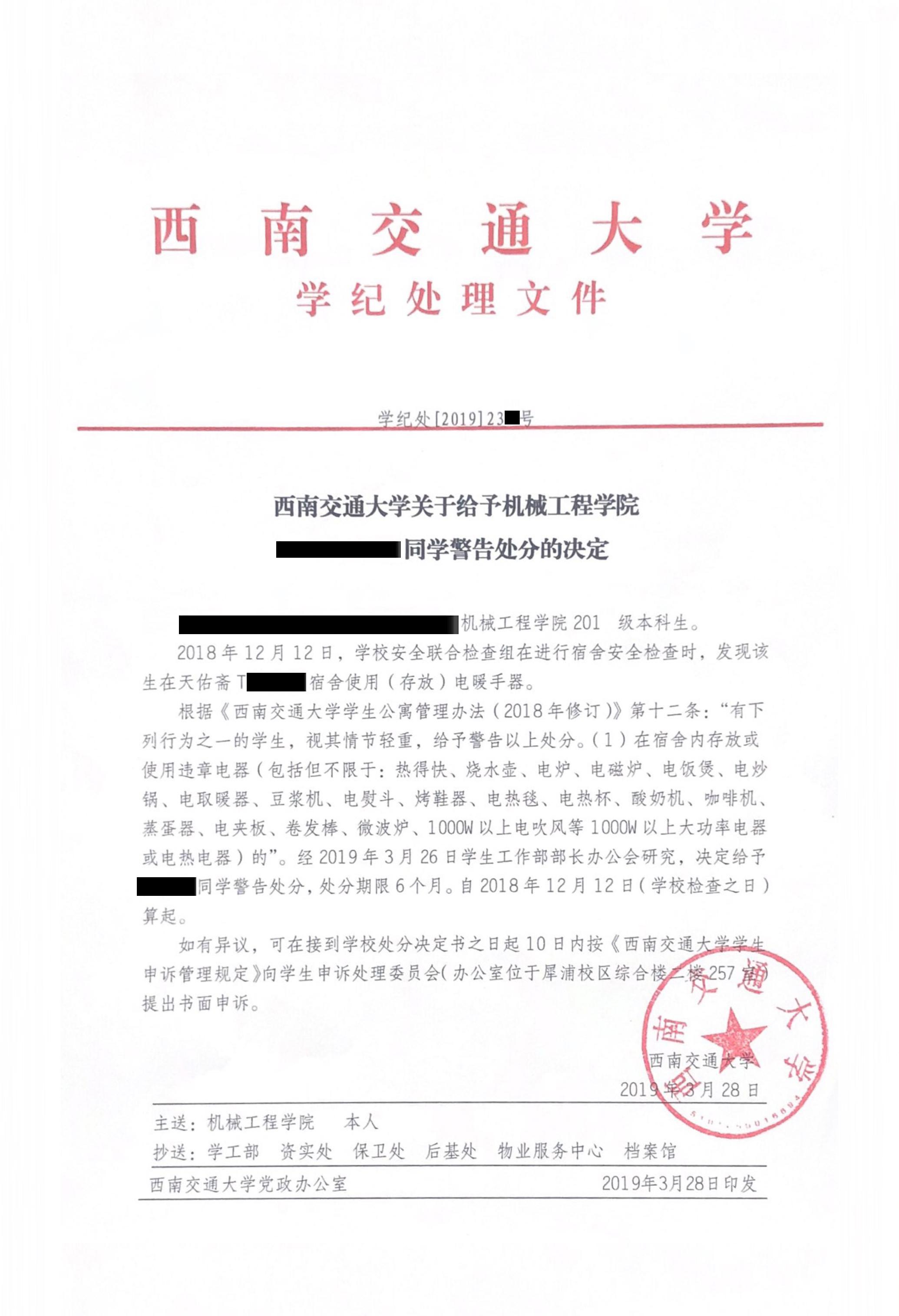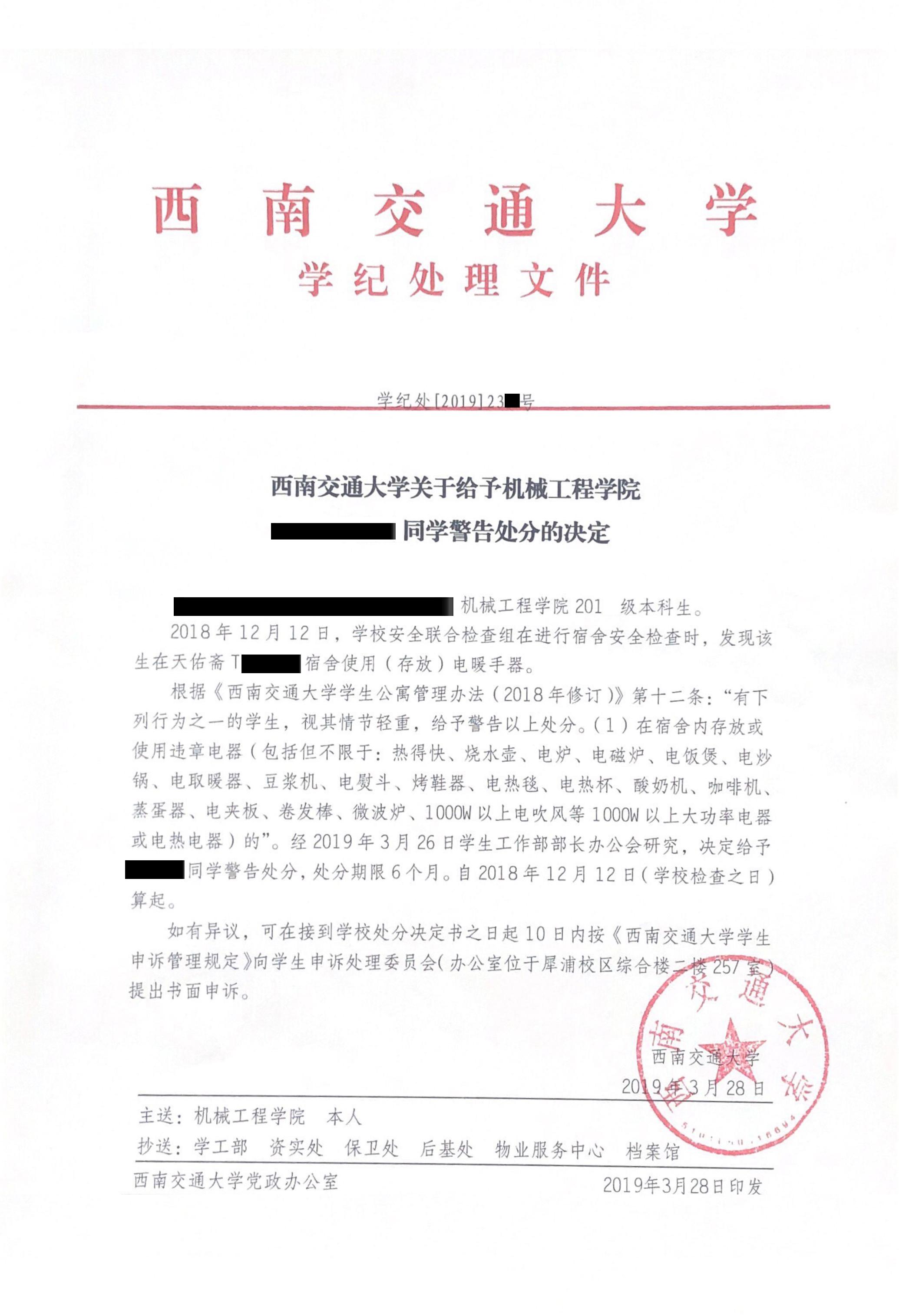 学校于2018年12月12日开展了学生公寓安全联合检查,本次检查中pp电子官方网站检查出两间寝室存放和使用违章电器,根据《pp电子官方网站学生公寓管理办法(2018年修订)》第十二条:有下列行为之一的学生,视其情节轻重,给予警告以上处分。触犯国家有关法律、法规的,依法移送公安机关。(1)在宿舍内存放或使用违章电器(包括但不限于:热得快、烧水壶、电炉、电磁炉、电饭煲、电炒锅、电取暖器、豆浆机、电熨斗、烤鞋器、电热毯、电热杯、酸奶机、咖啡机、蒸蛋器、电夹板、卷发棒、微波炉、1000W以上电吹风等1000W以上大功率电器或电热电器)的;经2019年3月26日学生工作部部长办公会研究,决定给予违纪的同学警告处分,处分期限6个月。