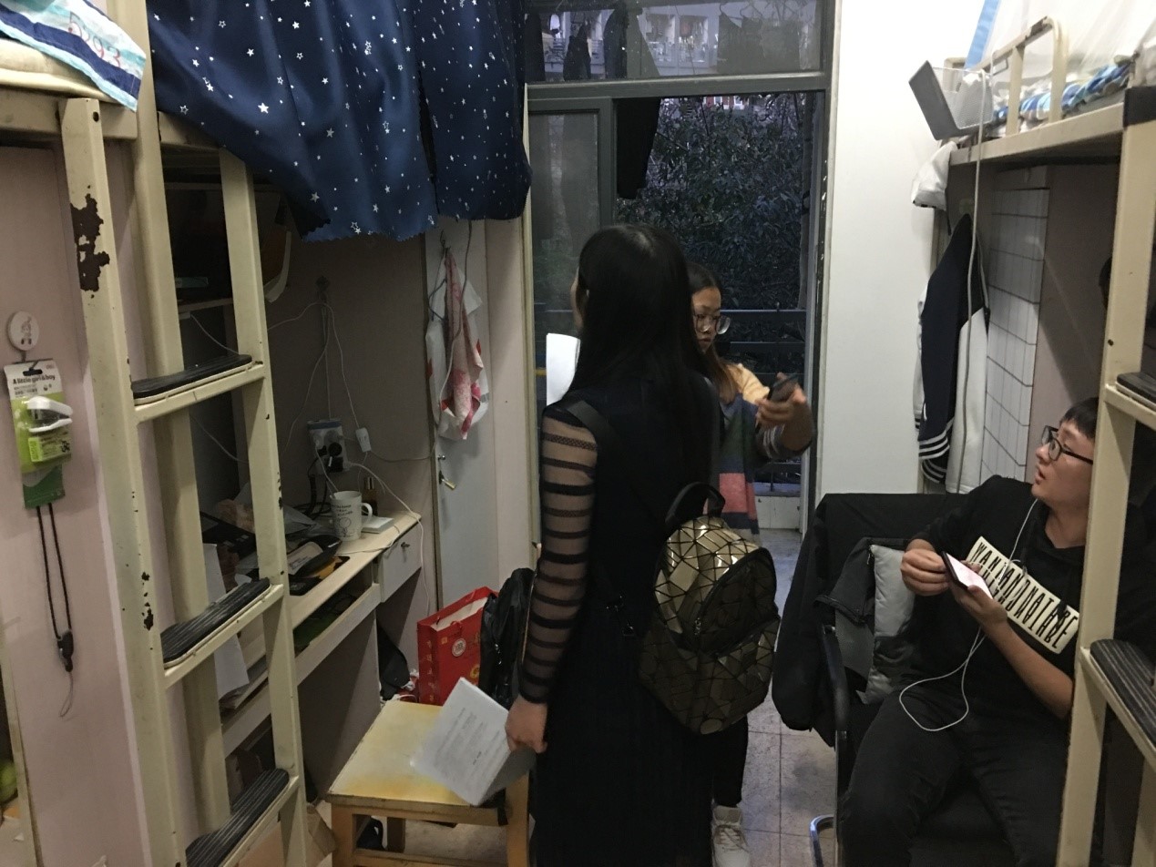 辅导员蔡俊俊老师、田友丽老师首先走访了男生宿舍,同学们均已按时返校,大部分同学在宿舍内学习或收拾东西,一些同学参加活动或外出自习不在宿舍,但也有些同学在寝室打游戏。同学们对老师的到来反应积极,表示欢迎,礼貌地向老师打招呼并反映宿舍的一些情况。大多数宿舍比较整洁,对于卫生情况较差的宿舍,两位老师做了记录并提醒他们及时整改;同时两位老师还对违章电器进行了排查,整体情况良好,并未发现违章电器。