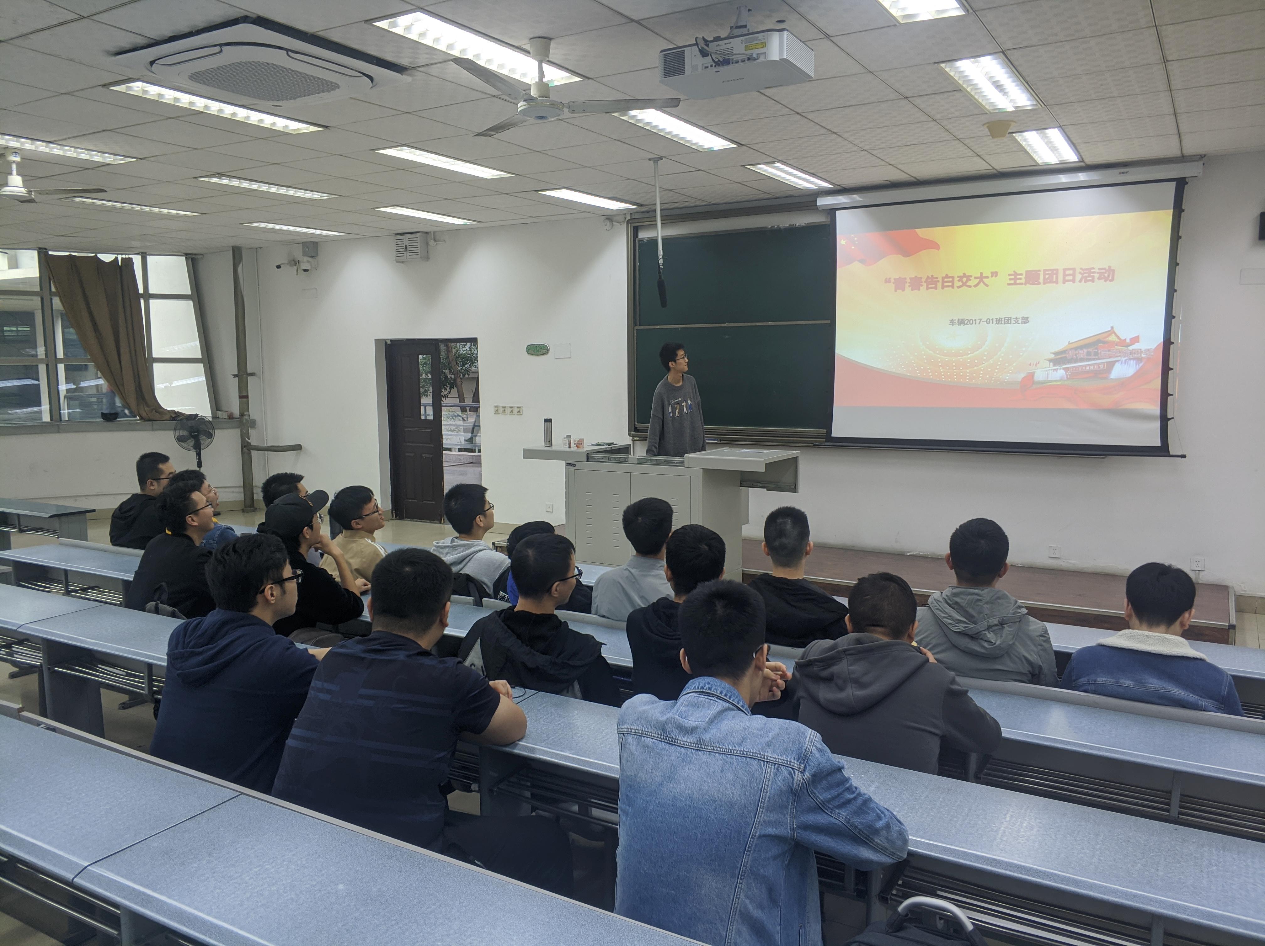 为弘扬新时代爱国主义精神,强化国家意识和集体观念,国庆节期间,各团支部可通过“读、写、拍、画、创、听、说、演、唱”等形式,打造富含爱国主义精神的校园文化活动、网络文化作品、创新创业项目等团支部特色品牌,生动真挚表达爱国热情。pp电子官方网站车辆2017级1班团支部在2020年10月10日下午4点半左右在X1215教室开展“青春告白交大”主题团日活动。