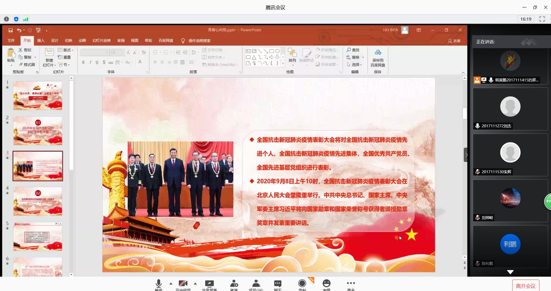 韩寅鹏同学就疫情期间发生的各种事情进行了简单的回顾,然后和同学们重温了习近平总书记重要讲话并对疫情期间奋斗在疫情一线的最美逆行者进行学习,结合2020年全国抗击新冠肺炎疫情表彰大会,韩寅鹏同学又带领同学们深入了解学习国家功勋模范人物、新时代楷模和战“疫”英雄,学习先进人物把自己的理想同国家的理想、把自己的人生同民族的命运紧密联系在一起,担当奉献,砥砺奋斗。新冠肺炎疫情是百年来全球发生的最严重的传染病大流行,是新中国成立以来中国遭遇的传播速度最快、感染范围最广、防控难度最大的重大突发公共卫生事件。病毒突袭而至,疫情来势汹汹,人民生命安全和身体健康面临严重威胁。我们坚持人民至上、生命至上,以坚定果敢的勇气和坚忍不拔的决心,同时间赛跑、与病魔较量,迅速打响疫情防控的人民战争、总体战、阻击战,用1个多月的时间初步遏制疫情蔓延势头,用2个月左右的时间将本土每日新增病例控制在个位数以内,用3个月左右的时间取得武汉保卫战、湖北保卫战的决定性成果,进而又接连打了几场局部地区聚集性疫情歼灭战,夺取了全国抗疫斗争重大战略成果。在此基础上,我们统筹推进疫情防控和经济社会发展工作,抓紧恢复生产生活秩序,取得显著成效。中国的抗疫斗争,充分展现了中国精神、中国力量、中国担当。同学们深有感触,纷纷分享了自己在疫情期间做出了哪些贡献。“励志担当成材,青春告白祖国”,同学们表达了对祖国的深厚感情。