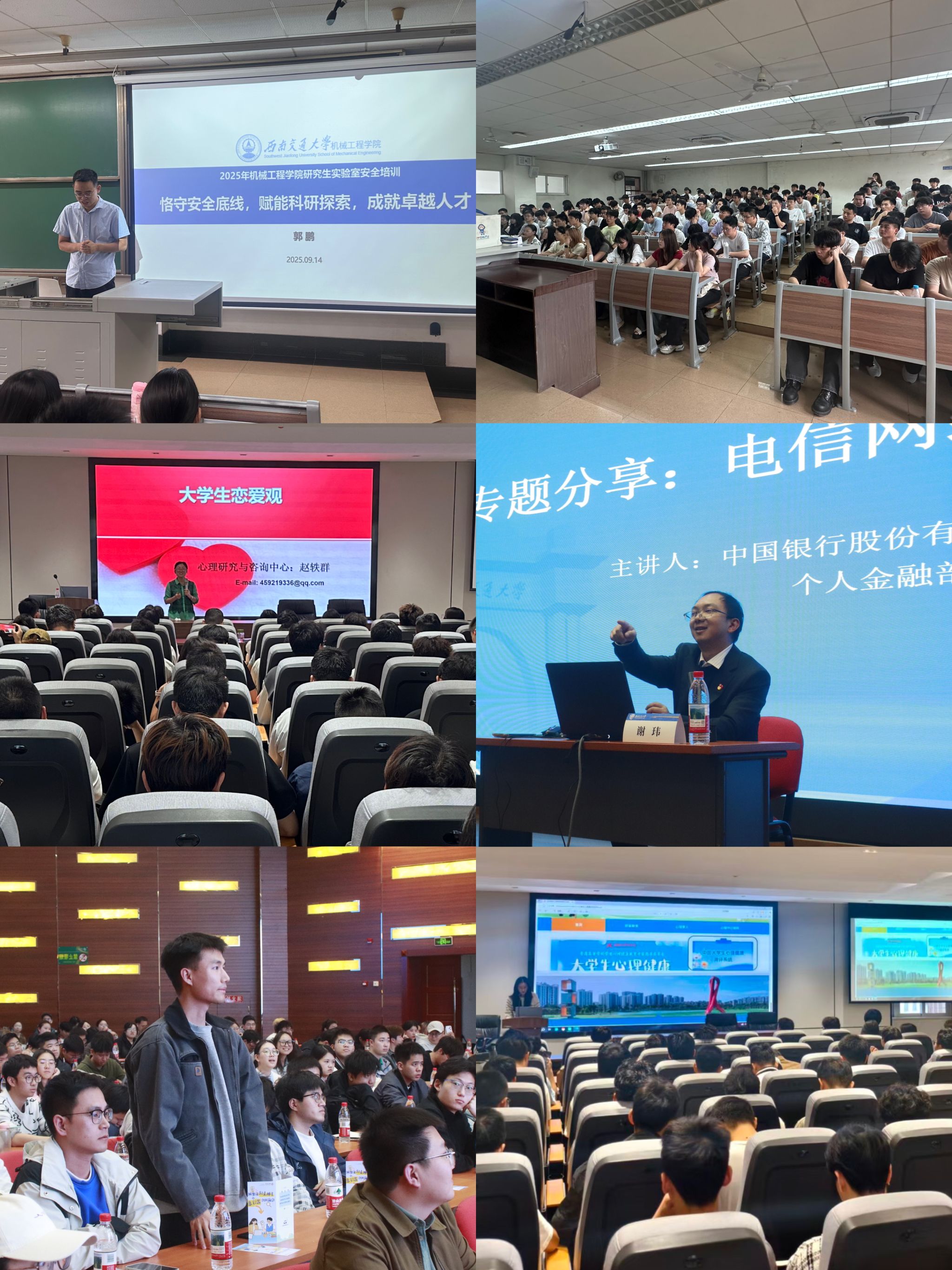以精“筑”防线为根本,护航成长阶梯,守牢校园安垣。坚持“安全为先,育心赋能”的原则,多维度筑牢新生成长保障。邀请工程机械系郭鹏老师讲解“实验室安全教育”专题讲座,聚焦实验室安全管理核心,解读仪器操作、危化品管理、消防应急等关键要点,强化新生实验室安全意识。由党委研究生工作部主办、pp电子官方网站承办防范电信网络诈骗专题讲座,特邀中国银行嘉宾谢玮主讲,围绕电信网络诈骗防范展开,旨在提升研究生反诈意识与应对能力。邀请心理咨询研究中心赵轶群老师开展“价值观与恋爱观”主题讲座,科普心理健康知识,引导新生树立积极观念。辅导员组织全体新生开展线下心理测评,全面掌握新生心理状况,并持续推进跟踪工作,为新生心理健康构建全链条保障。
