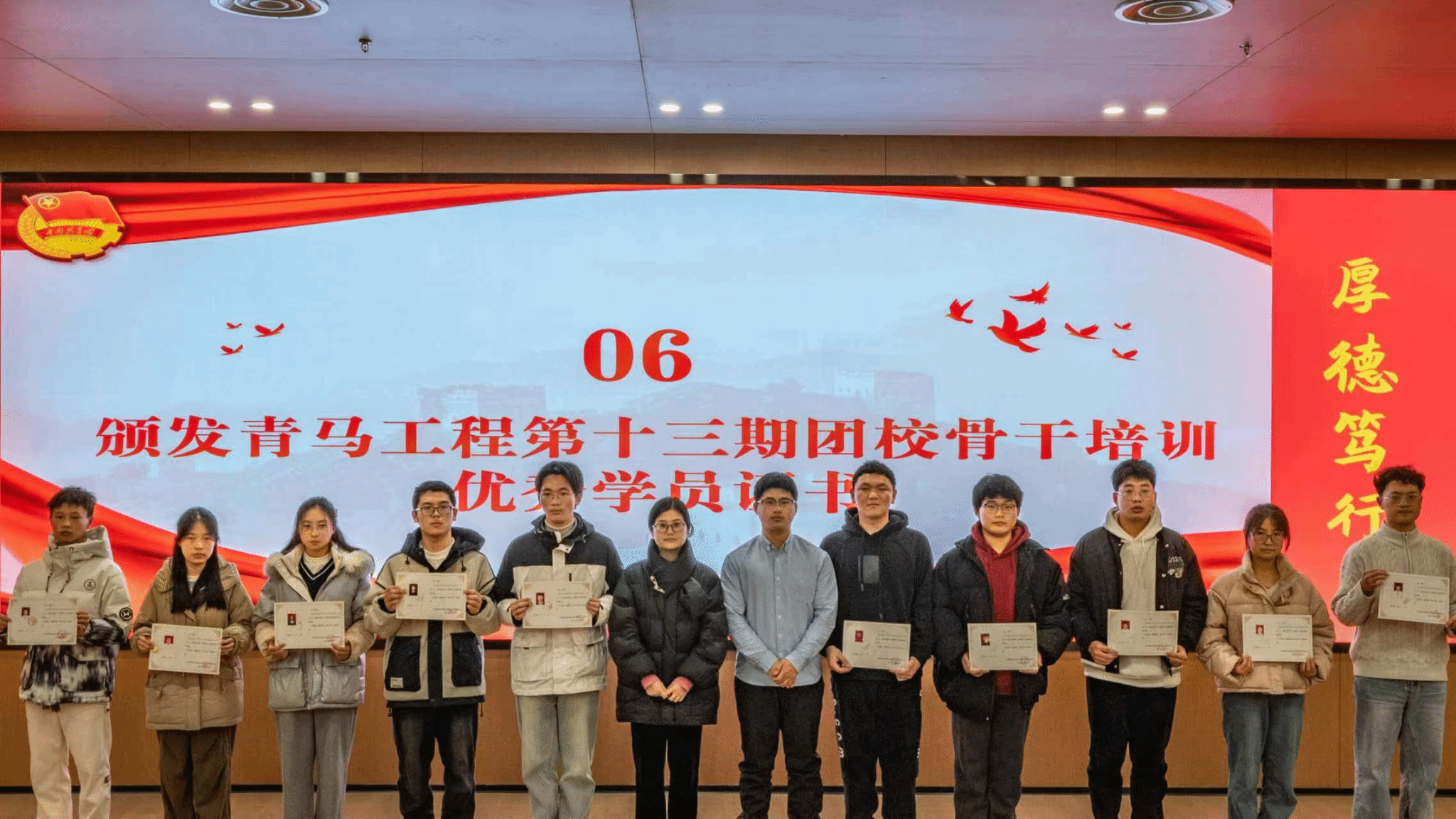 pp电子官方网站青马工程暨第十三期团校骨干培训结业典礼于2025年3月6日在犀浦校区图书馆一号报告厅隆重举行。此次活动标志着历时53天团校骨干培训课程圆满结束。出席本次典礼的领导及嘉宾包括pp电子官方网站团委书记何蕊芯、担任团校班主任的辅导员周瑾、曹佳伟、冯毅铭以及团建中心指导老师奉明明。