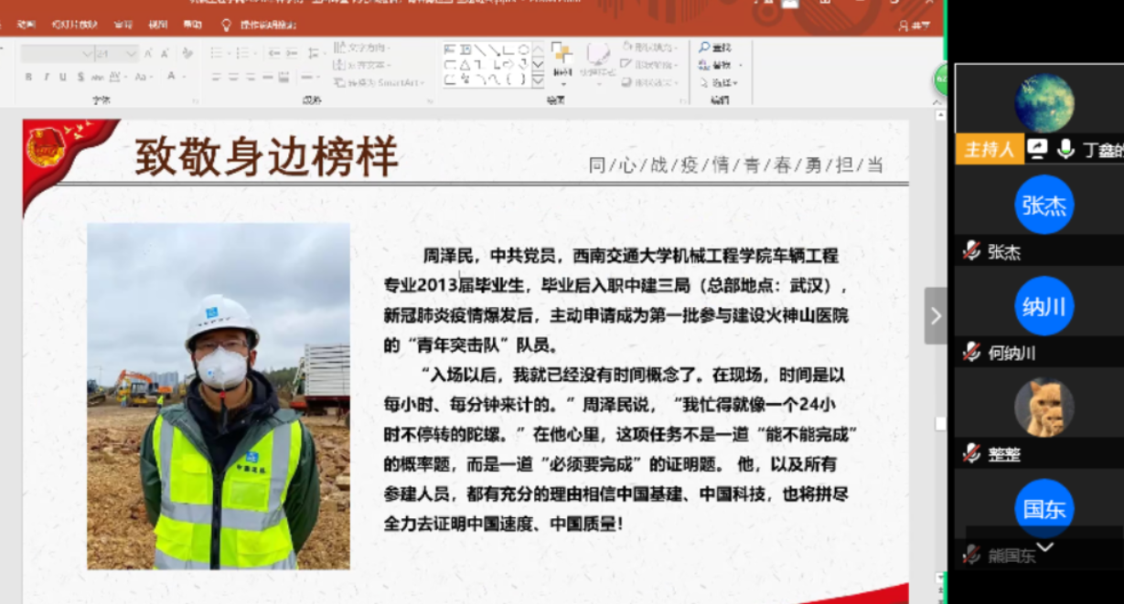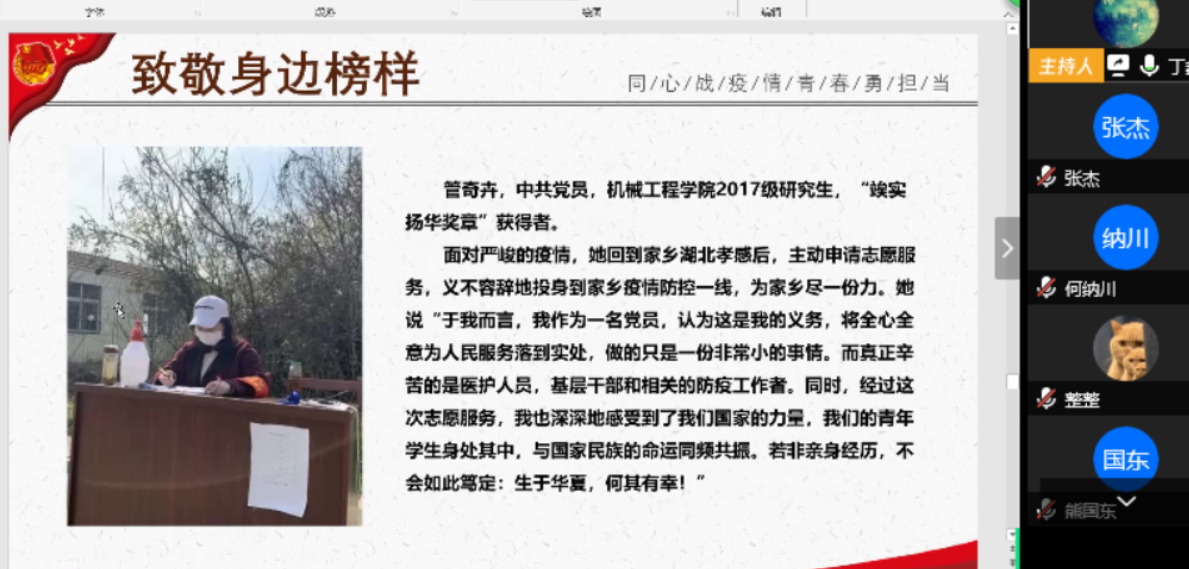 然后,团支书丁鑫分别从 “疫情中的榜样力量”、“疫情中的青年责任”和“奋斗不懈”三个方面探讨疫情。在他的带领下,同学们围绕习近平总书记给“援鄂90后”党员的回信内容及“新时代青年的责任与担当”展开了积极的讨论。