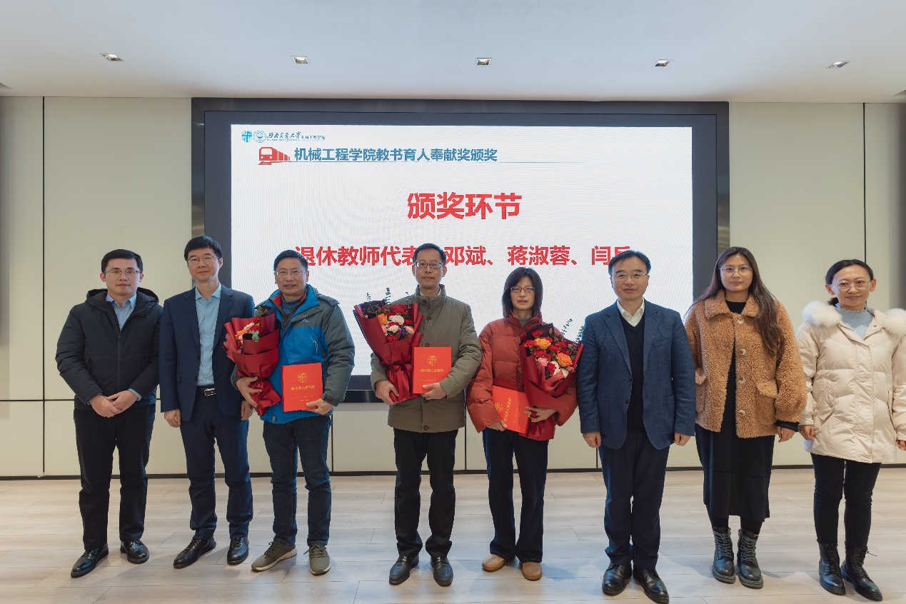 在“教书育人奉献奖”颁奖环节,学院党委袁艳平书记、钱林茂院长分别为荣休教师代表邓斌、蒋淑蓉、闫兵颁发了学院定制专属的“教书育人奉献奖”荣誉奖杯,李世超、孙丽丽、黄燕老师分别为荣休教师献上了鲜花,以此感谢把青春和智慧都用在了学院的人才培养、科学研究、事业发展过程中,为学院的发展做出了独特而重要贡献的荣休教师。希望各位荣休教师继续关心支持学院工作,发挥余热、建言献策,为学院发展建设贡献智慧和力量。