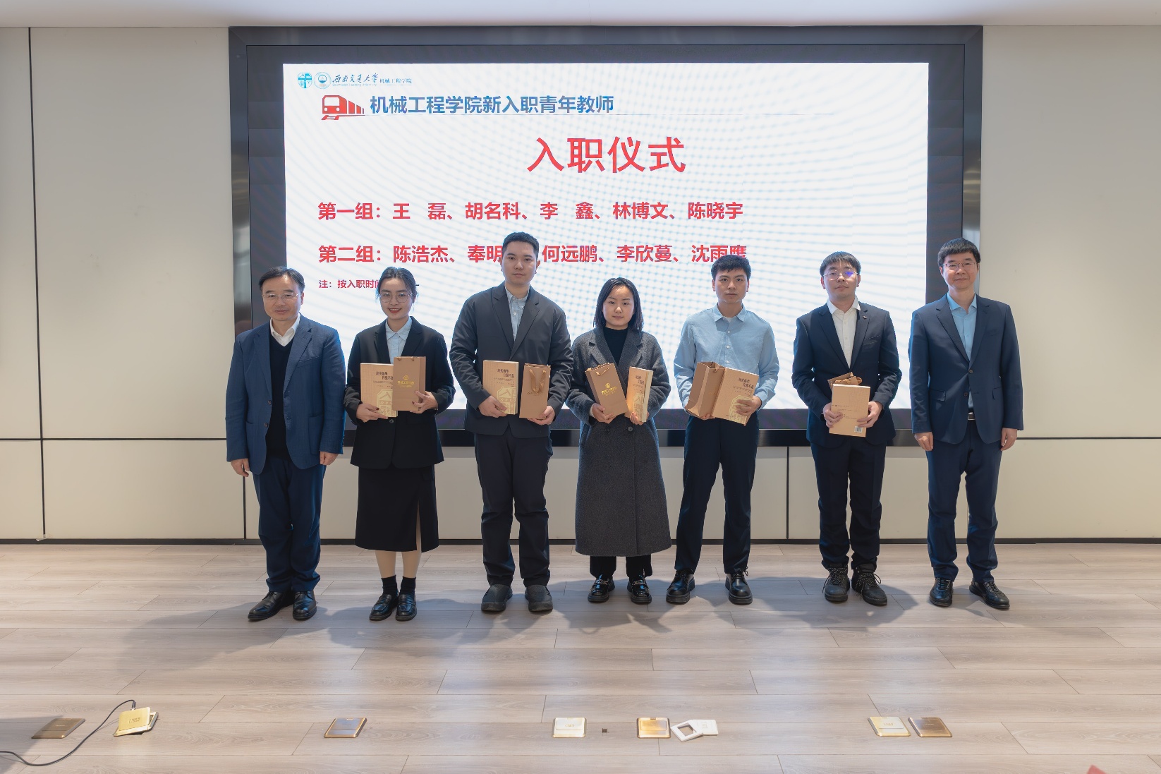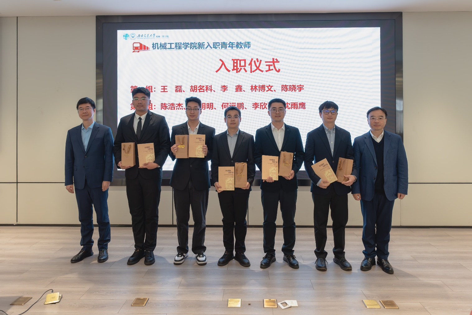 在新进教职工入职仪式中,学院党委袁艳平书记、钱林茂院长对新入职的10位老师表示了热烈欢迎,并为每位新入职老师准备了一份学院特色纪念品。希望新入职的老师们传承百年机械精神、接过前辈们的接力棒,积极承担新时代老师的使命与担当,落实立德树人根本任务,努力提高自身能力水平,为学院的高质量发展贡献力量。