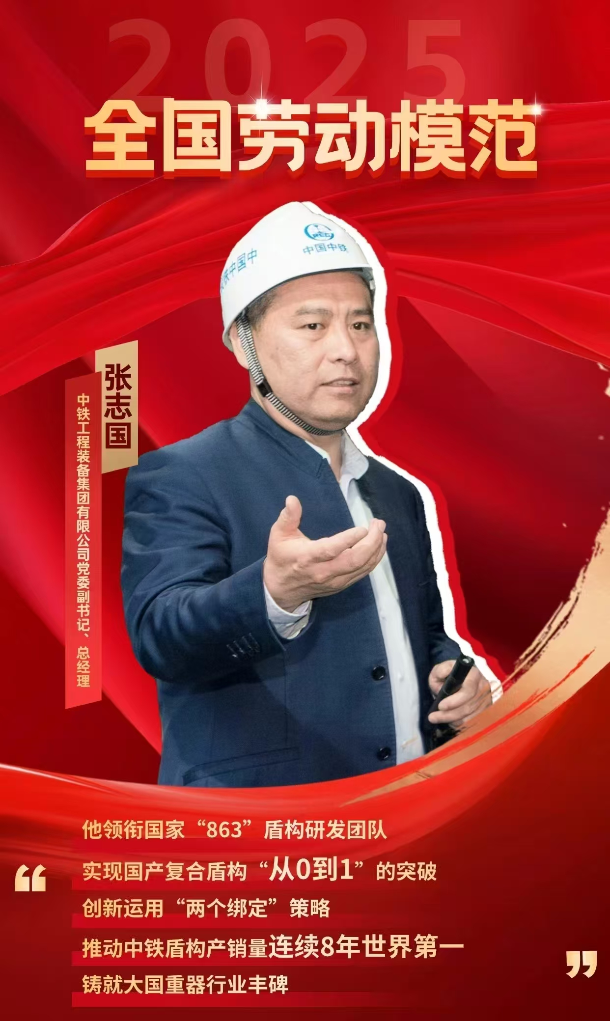 张志国,男,1978年9月出生,中共党员,正高级工程师,现任中铁工业副总经理。作为国家“863”计划盾构研发团队的一员,和团队成功研制我国首台具有自主产权的复合式盾构“中国中铁1号”,实现国产盾构“从0到1”的突破。践行“中铁装备,装备中国,装备世界”的宏伟愿景,策划并推动成功收购德国维尔特硬岩掘进机及竖井钻机知识产权和品牌的谈判,极大提升业内影响力。创新运用“两个绑定”策略,带领销售团队成功进军新加坡、马来西亚、法国、德国、澳大利亚和加拿大等市场,助力企业累计出口120余台盾构机至30多个国家和地区。