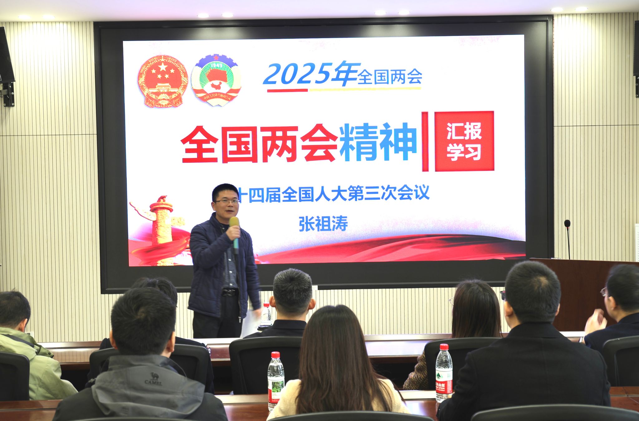 报告会上,张祖涛教授简要介绍了全国两会召开的整体情况,概括梳理了《政府工作报告》要点,深入解读了四川代表团的会议情况。他结合自己作为全国人大代表参与两会的亲身经历和感受,生动分享了全国人大代表们围绕国家重大问题展开讨论、积极建言献策的深刻体会。