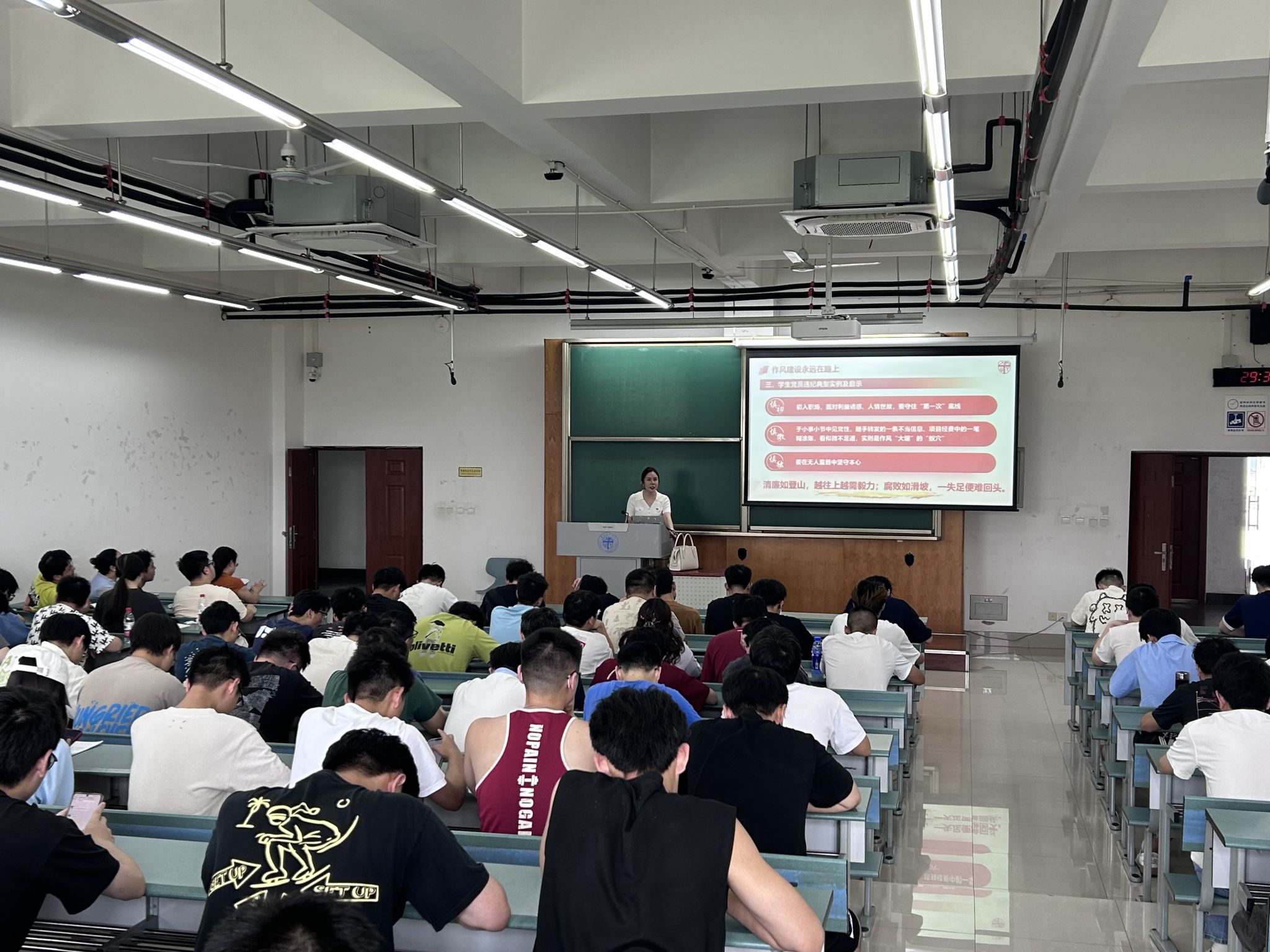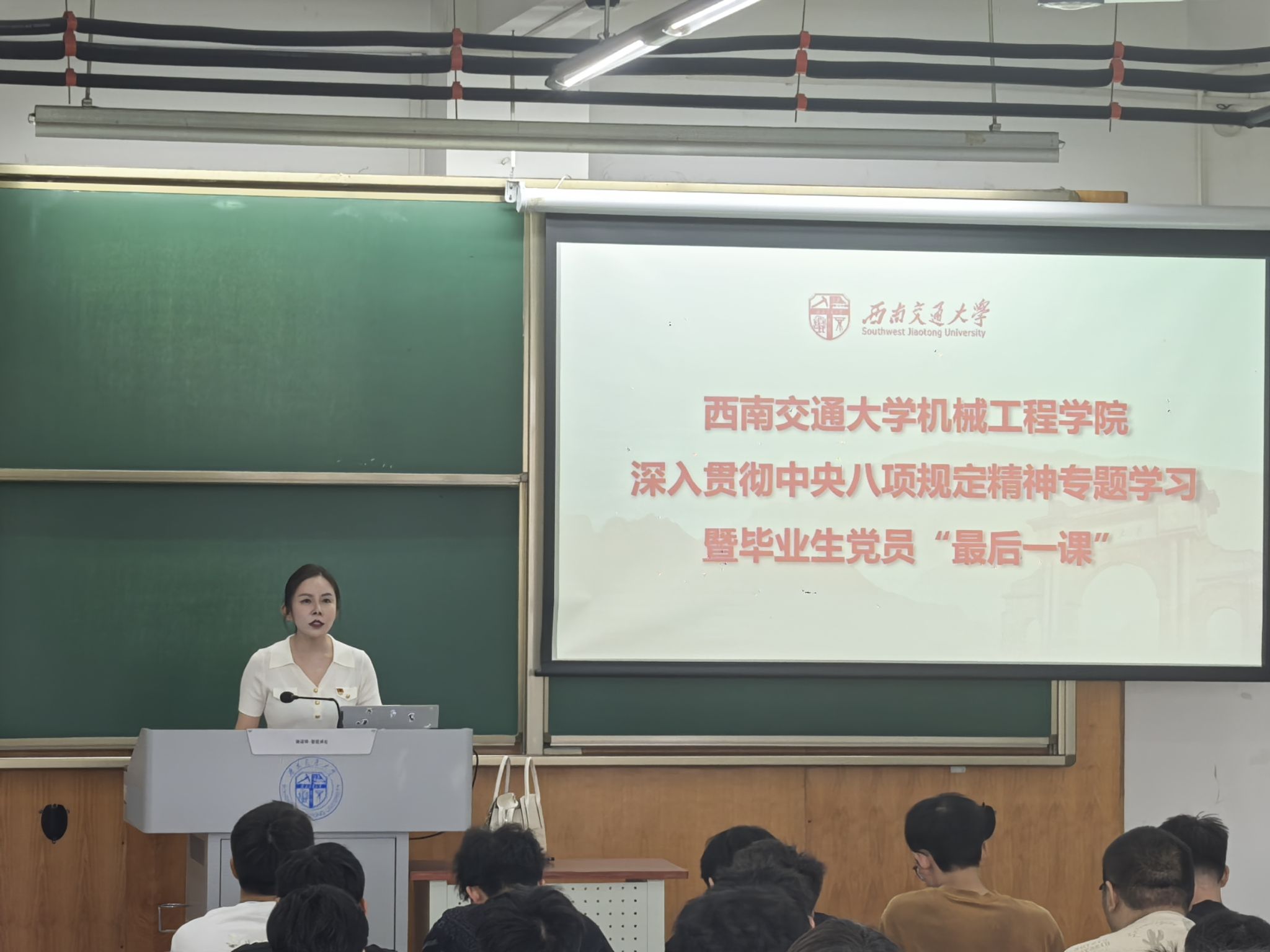 为引导毕业生党员坚定理想信念,筑牢廉洁从业思想根基,6月17日,pp电子官方网站在犀浦校区四号教学楼举办深入贯彻中央八项规定精神学习教育专题党课暨毕业生党员“最后一课”。学院党委副书记沙晓雪担任主讲。