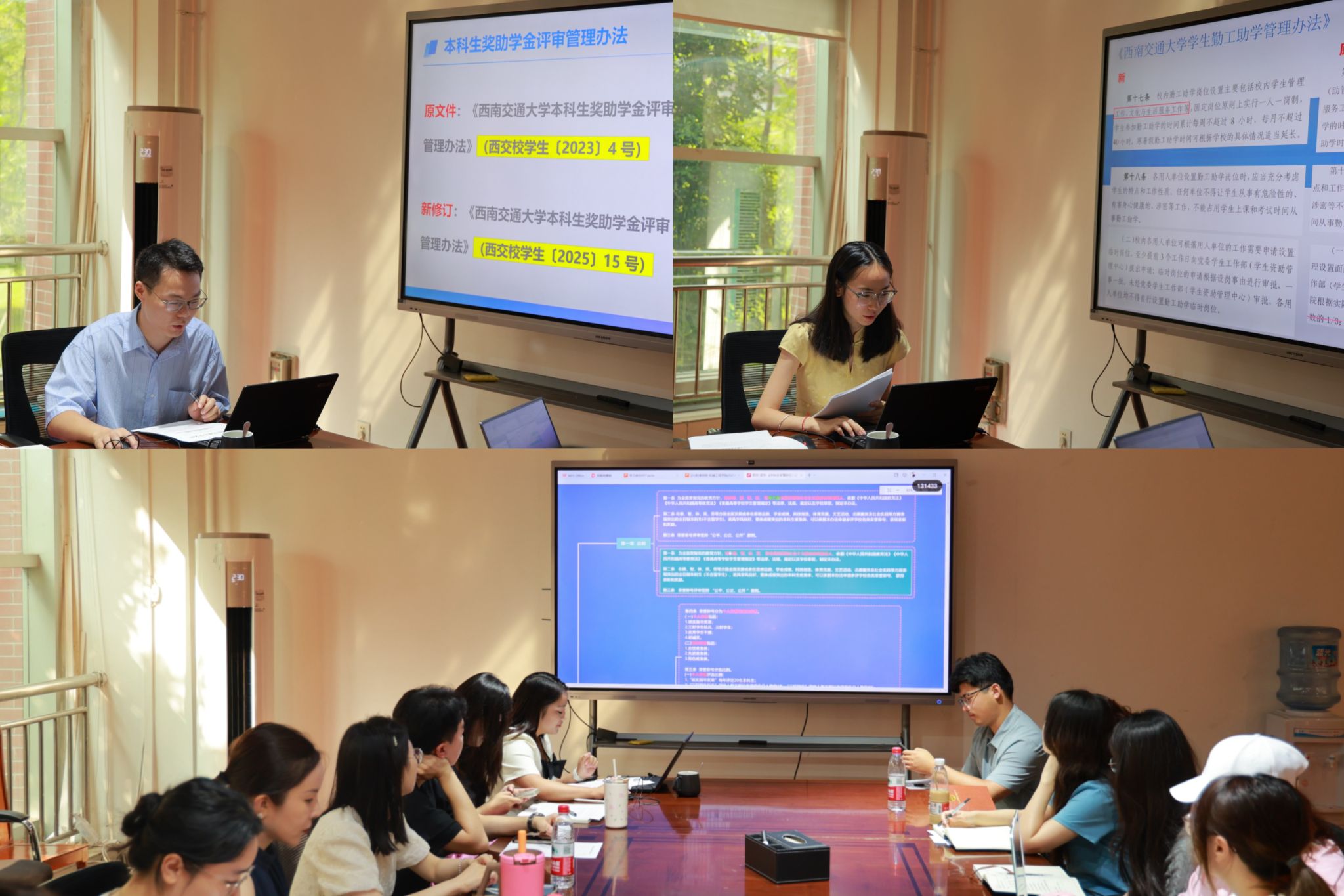 张翔、罗洪、胡雨欣三位辅导员分别结合自己所负责的专项工作,对学校新修订的《pp电子官方网站本科生国家奖助学金评审管理办法》(西交校学生〔2025〕16号)、《pp电子官方网站本科生荣誉称号评审管理办法》(西交校学生〔2025〕13号)、《pp电子官方网站学生困难补助管理办法》(西交校学生〔2025〕22号)等11个学生管理制度文件进行了领学,详细对比了新旧文件的区别,帮助辅导员老师们准确理解文件的具体内容,方便后续相关工作开展。