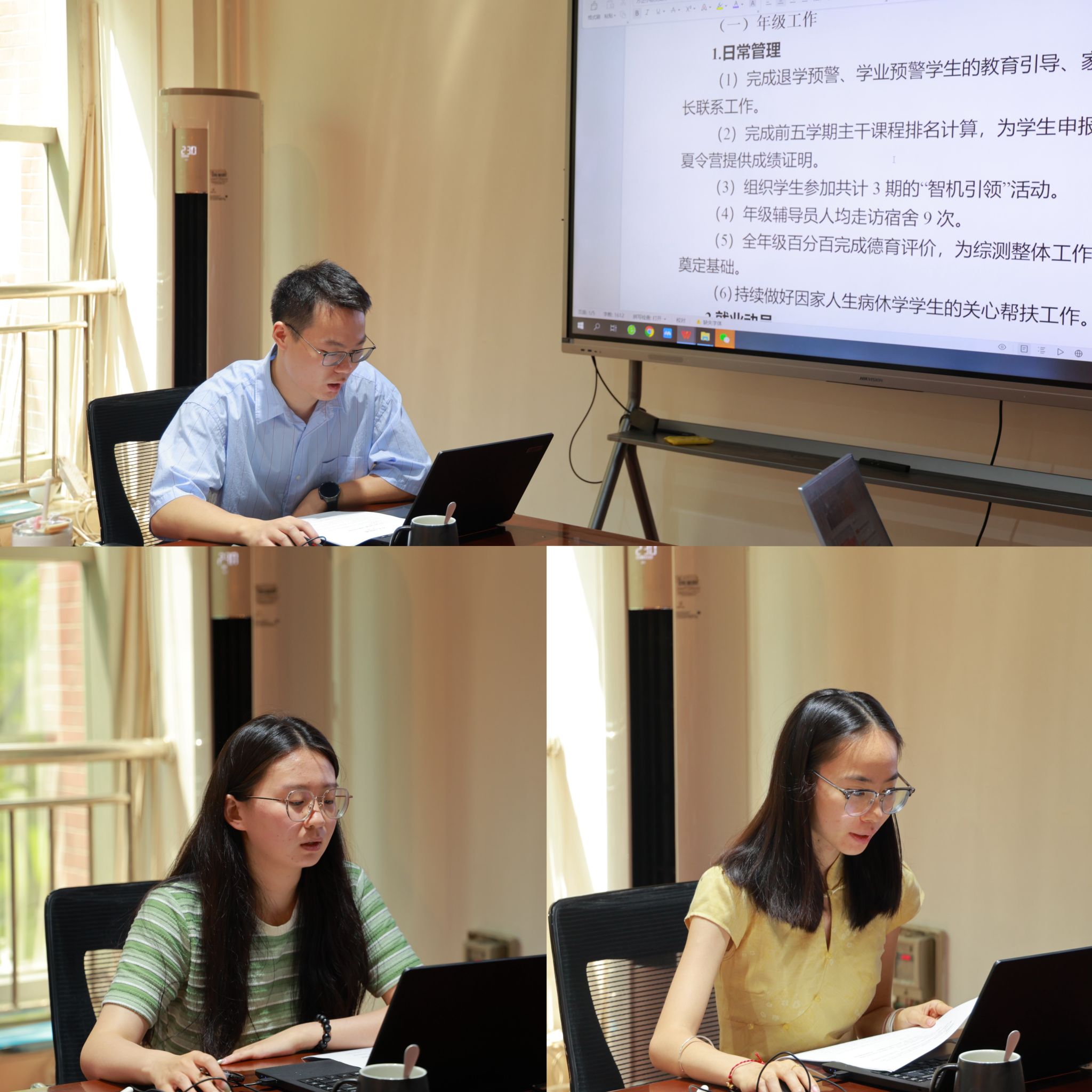 全体专兼免辅导员逐一对各自的辅导员日常工作和专项工作开展情况进行了梳理总结,并剖析谋划了下半年的工作计划和工作重点。
