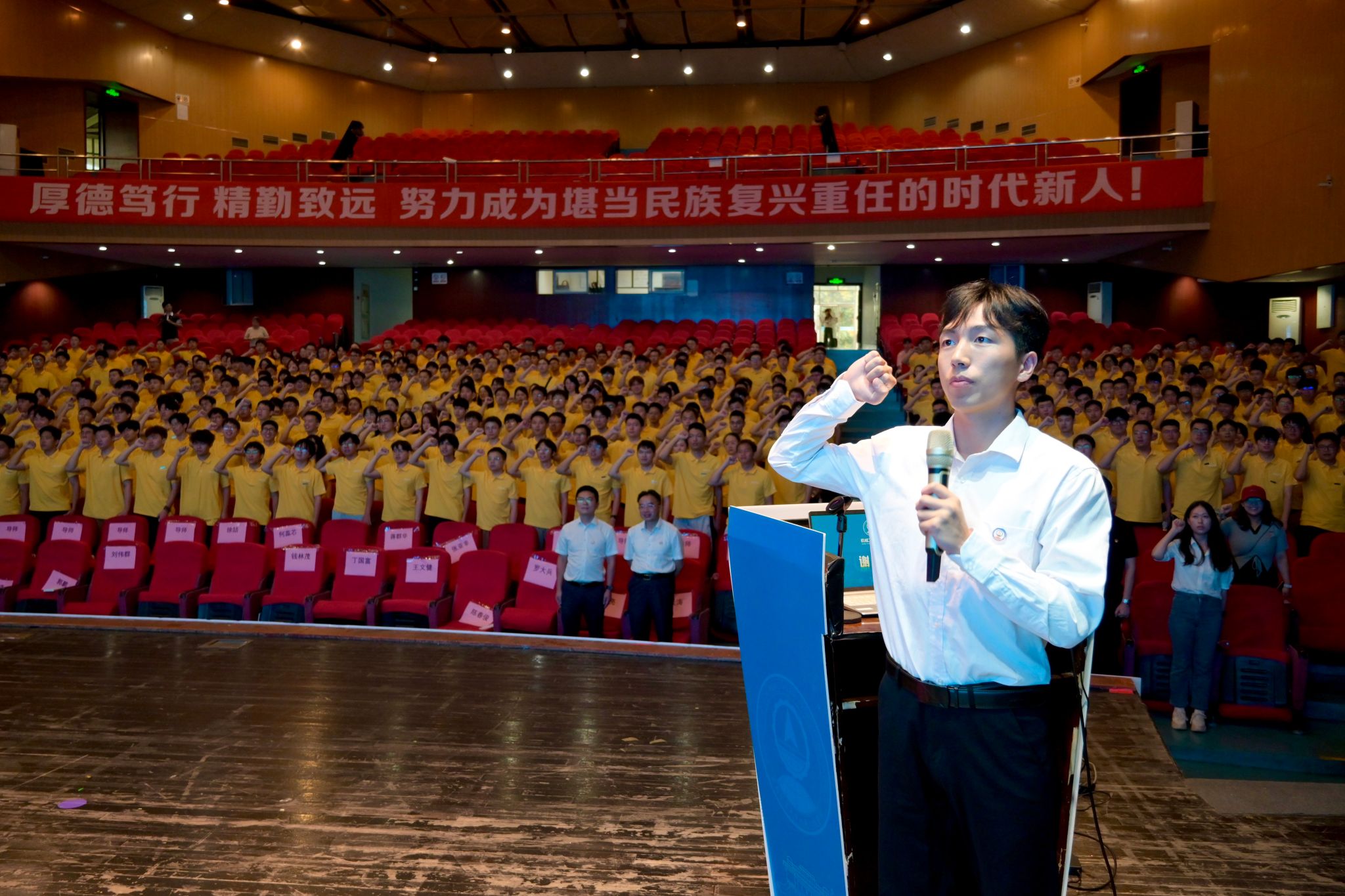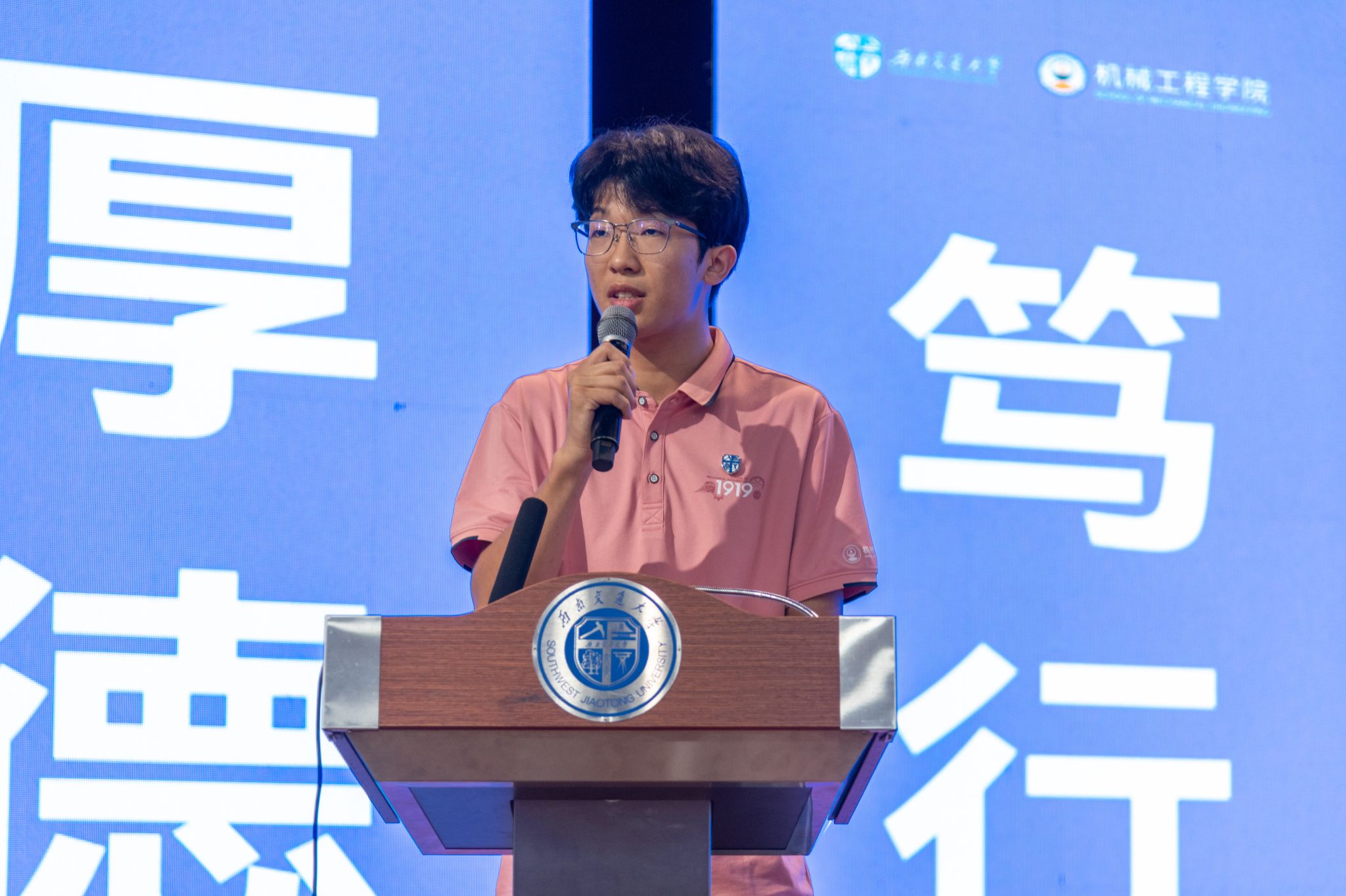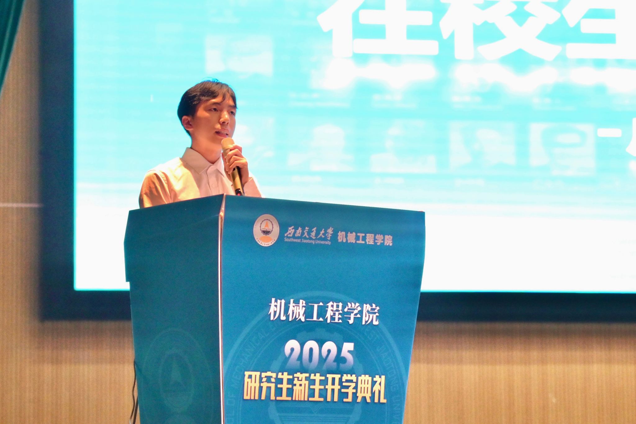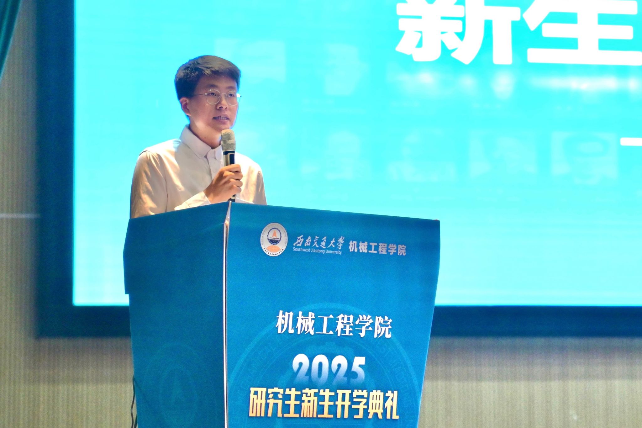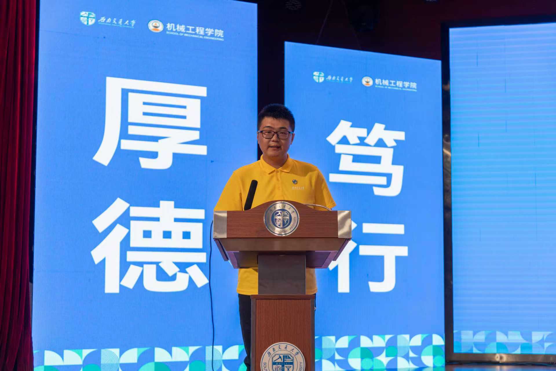 研究生新生代表兰晓丹回顾了自硕士阶段起在交大机械学院的求学经历,分享了从课程学习转向科研探索过程中的成长与收获,为新生同学们提供了宝贵的经验。本科新生李学森深情分享了“机械”二字于他而言的重要意义,他希望能与优秀的同龄人并肩作战,在科创竞赛中头脑风暴,在项目攻关中挥洒汗水,努力成长为具有家国情怀、全球视野、创新精神和实践能力的新一代机械工程师。