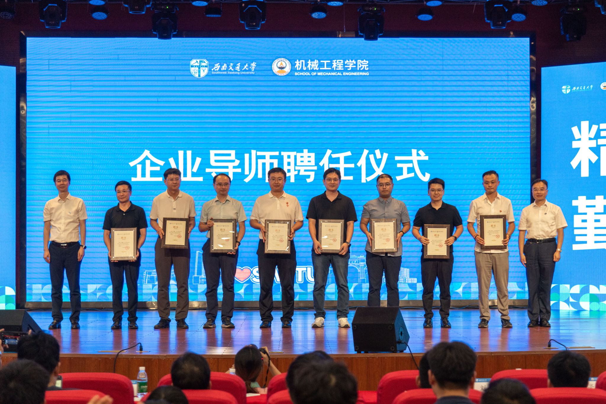 典礼上进行了企业导师聘任仪式,袁艳平书记、钱林茂院长为企业导师代表颁发聘书。据悉,2025年学院共选聘了23位有机械相关行业从业经历或职能管理经历丰富的企业专家、优秀校友担任2024级班级企业生涯导师。