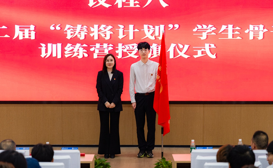 沙晓雪为第二届“铸将计划”学生骨干训练营授旗,青年志愿者协会会长崔玉硕代表全体参培学员受旗。