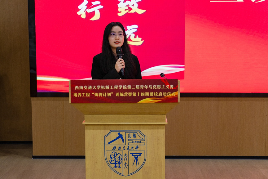第一届“铸将计划”骨干训练营学员代表、2022级机械设计制造及其自动化专业骆月桐代表第一届参培学员发言,她分享了自己在培训过程中的收获和感悟,号召大家以此次培训为新的起点,保持空杯心态,积极投身实践,热心服务同学,成长为眼中有光、心中有责、脚下有力的新时代青年先锋。