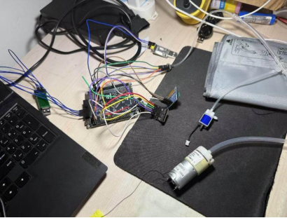 后续的代码调试工作将在这块焊接好的PCB板上进行,直到能测量并显示出较为准确的血压脉搏值。目前已经有部分功能能够实现,包括按键功能、充气泵与泄压阀的定时开闭、OLED的显示等。下图展示的是血压脉搏计的硬件连接图: