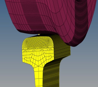 (2)因为Hypermesh出众的网格划分能力,同时为了兼顾求解精度与效率。根据圣维南原理,在Hypermesh中,对轮轨接触部分网格采取细化,而对于其余部分网格粗化。具体步骤为:选取车轮截面,在车轮接触点为中心,根据接触钢轨横截面的情况,向车轮内外侧扩展一定距离,向车轮径向扩展24mm。此处区域网格尺寸为1.5×1.5mm的面网格。车轮横截面其他区域,则逐步扩大网格尺寸,依次为1.5、3、5、10。最后,以车轴为旋转中心,进行旋转,得到实体网格。钢轨的网格划分方法类似。