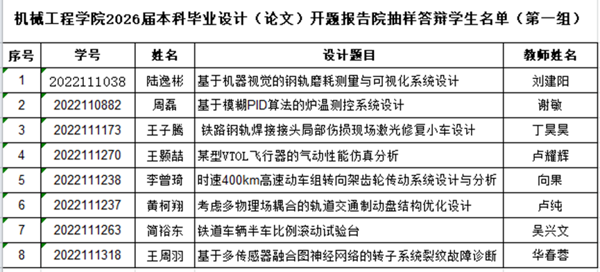 系所普查时间为2026年1月4日-1月16日,各系所参照学院抽查阶段的工作要求,组织2026届本科生毕业设计(论文)开题报告答辩工作,要求覆盖全体学生。请各系所于12月30日前将《pp电子官方网站2026届毕业设计开题答辩信息统计表》发送至邮箱jxbkjw@swjtu.edu.cn。