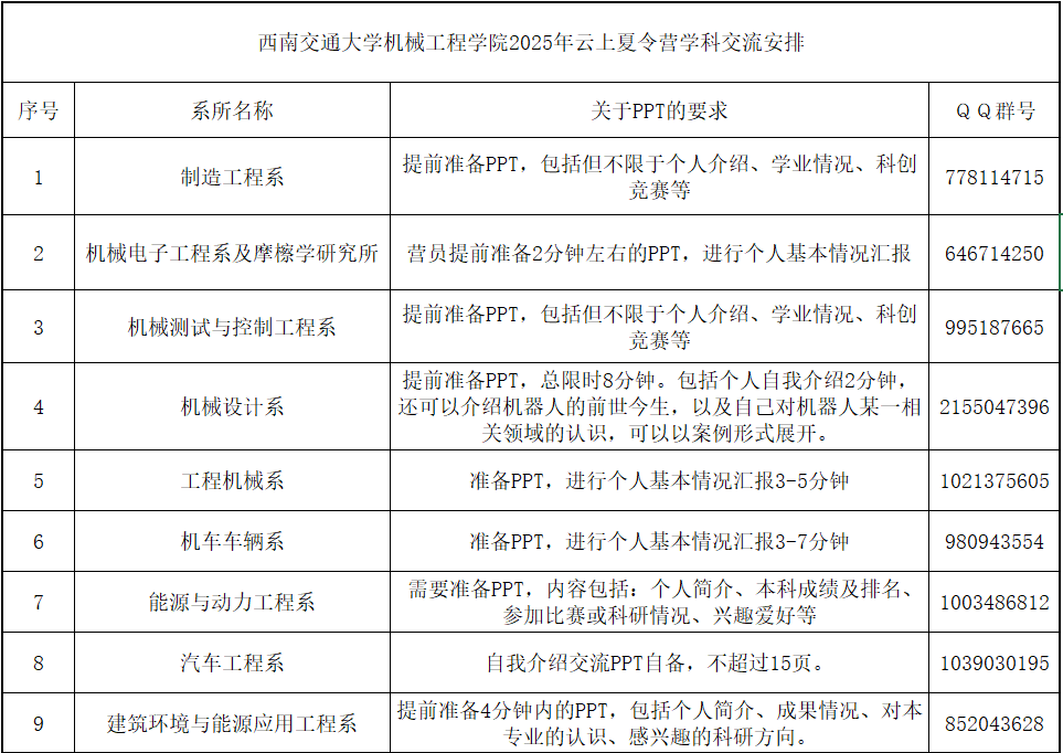 7月3日下午14:00开始,营员分系所参加系所交流活动,各系所关于PPT的要求及交流活动的QQ群号如下: