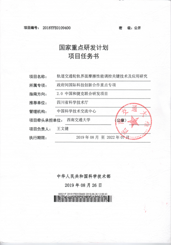 The research on key technology and application of friction property control of wheel - rail interface in railway transit is a national key R&D program intergovernmental key items for international scientific and technological innovation cooperation project among Southwest Jiaotong University and China Academy of Railway Sciences Research Group Co., Ltd. from P.R. China and Brno University of Technology and TriboTec from Czech Republic. This project aims to revealing the evolution mechanism and key influence factors of friction property on wheel – rail interface, developing the key technology, new products and equipment for controling the friction on wheel – rail interface in the complex environment, and completing the field application specification. The implementation of this project could accelerate the development of wheel-rail system maintenance technology in China and Czech, and provide an important demonstration role for the implementation of the "One Belt One Road" railway facility connectivity strategy.
