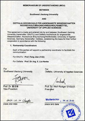Our side on December 10, 2010, and Germany side on January 31, 2011, formally signed the memorandum of cooperation between the two sides and " The Agreement about the German Ostfalia University of Applied Sciences to accept undergraduate graduates from Southwest Jiaotong University in China to study machinery in Disciplinary Systems Engineering on the Master Degree". Since 2011, every year, the Ostfalia University of Applied Sciences, can receive 8 students from the School of Mechanical Engineering to study for a master's degree for free.