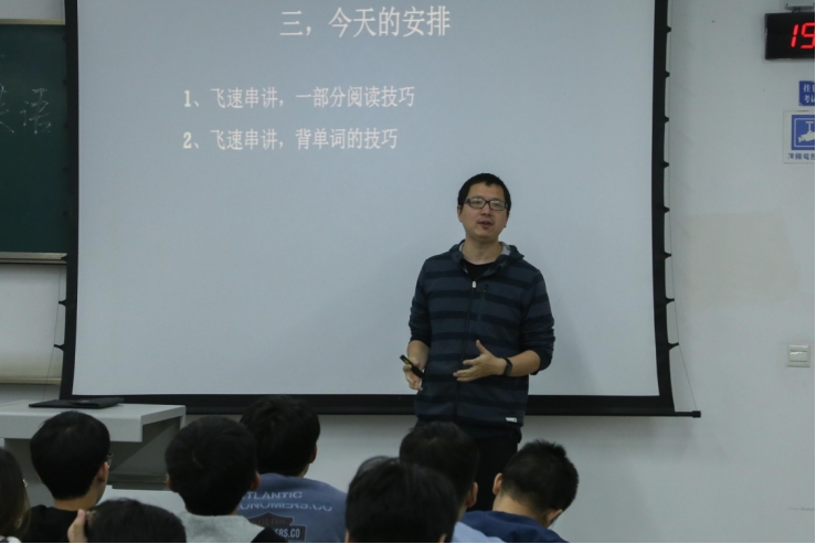 Then, in a round of applause, Mr. Deng Li began to share the dry goods of the English postgraduate entrance examination. Deng Li shared the skills of English reading comprehension in three parts: example problem method, theme problem method and misunderstanding of memorizing words. Mr. Deng Li pointed out that through the example structure, we can quickly know the general content of the article, so as to save a lot of answer time. When we encounter unknown words, we can make questions by judging their praise and criticism. Then, Mr. Deng stressed that most of the interference items are familiar, but they are changed in subtle places, so as to achieve the purpose of mixing fish's eyes with pearls. Therefore, when we do questions, we should have golden eyes and carefully distinguish the differences between the options and the original text. Finally, Mr. Deng Li shared with the students the practice of the main topic. It is proposed that we should mainly do the problem through the exclusion method, and the interference item will generally expand or narrow the scope, which requires us to find and compare the options with the scope words in the original text. "If you want to do a good job, you must first sharpen your tools." without a solid foundation of words, no matter how many skills are, they are just castles in the air. Finally, Mr. Deng stressed that the most simple and basic way to learn English is to recite words in a down-to-earth manner. We should consolidate our word foundation step by step.
