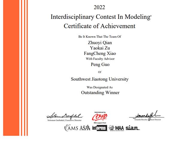 The 2022 American College Students' Mathematical Modeling Contest (mcm/icm, referred to as "the contest") recently announced the award results. Guopeng, a teacher of the school of mechanical engineering, instructed students qianzhuoyi (Industrial Engineering), xiaofangcheng (Industrial Engineering), zuyaokai (electronic information of the University of Electronic Science and Technology) to participate in the competition of question F. After several rounds of competition and selection, the team finally won the highest award - "outstanding winner (also known as o Award)". This year, 27205 teams participated in the event, with about 80000 participants. Only 44 teams were finally rated as "outstanding winner" (the winning proportion was only 0.16%), and 2 teams in Sichuan Province (the winning proportion was 4.6%). The o prize won by the team is the only one won by southwestjiaotonguniversity in this competition, which fully demonstrates the ability of mechanical students in practice and innovation. The above achievements are greatly benefited from the high attention paid by the University and the college to the cultivation of Undergraduate Practice and innovation ability, focusing on the efforts of high-quality quality development, actively building a multi-dimensional platform, and comprehensively improving the innovation spirit, entrepreneurship awareness and innovation and entrepreneurship ability of undergraduates.