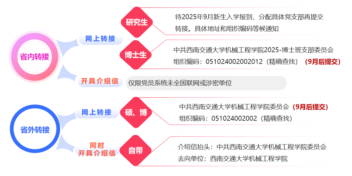 硕士转入:待2025年9月新生入学报到,分配具体党支部再提交转接。具体地址和组织编码等候通知。